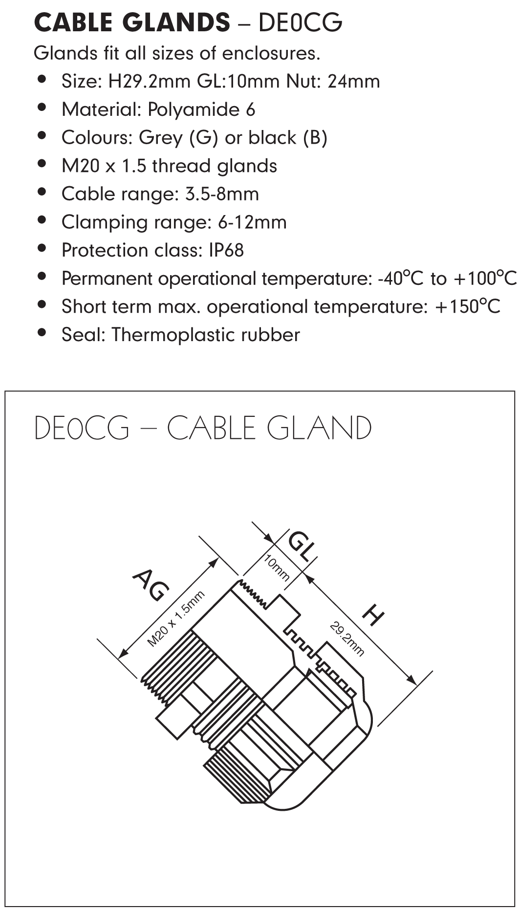 Polyamide 6, IP68 glands, fit all sizes of DE Series, size: H29.2mm GL: 10mm Nut: 24mm. M20 x 1.5 thread glands. Cable range 3.5-8mm, clamping range 6-12mm.