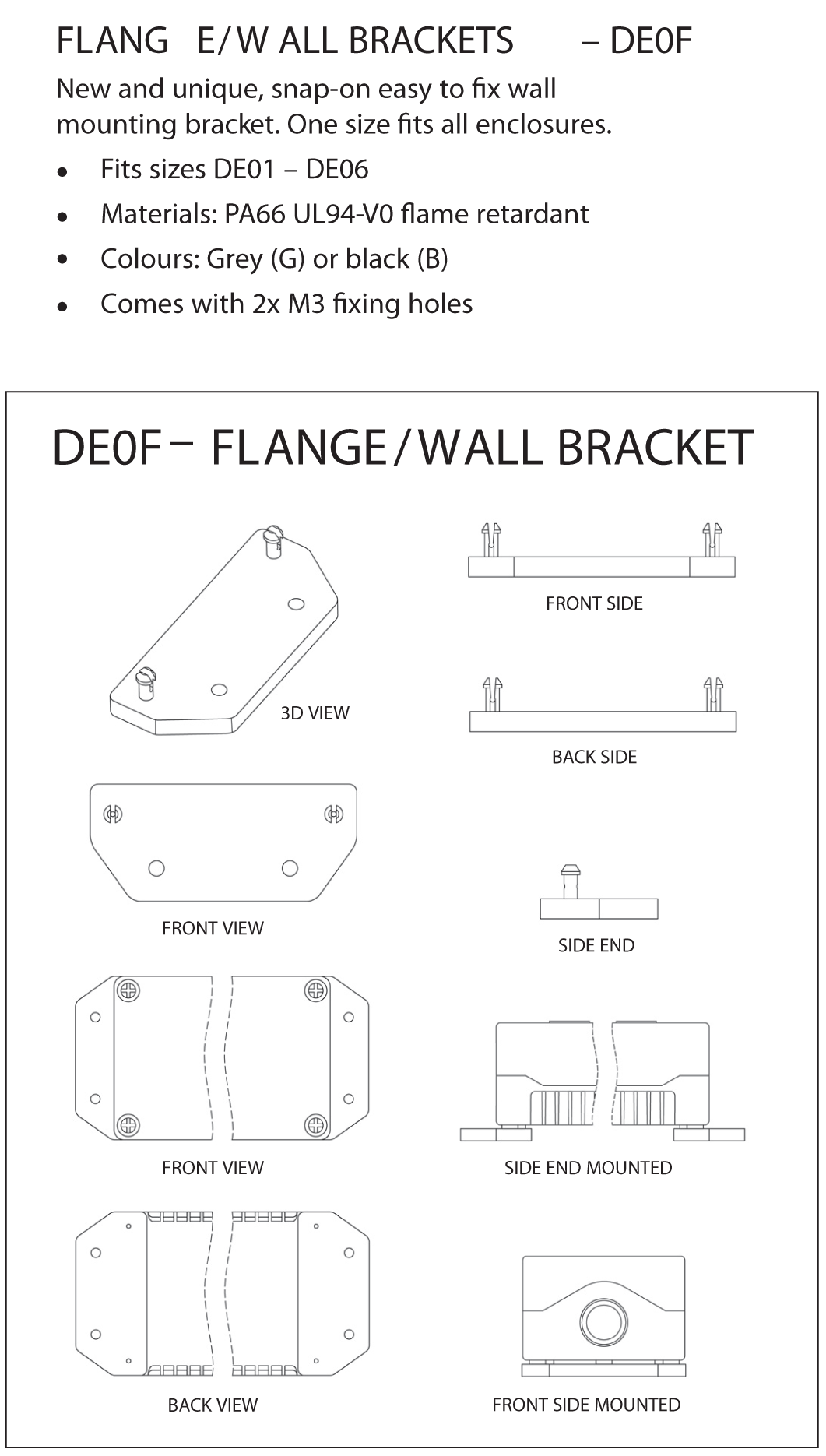 New and unique, snap-on easy to fix wall mounting bracket. One size fits all DE Series. Material PP66 UL94-V0 flame retardant. Comes with 2 x M3 fixing holes.