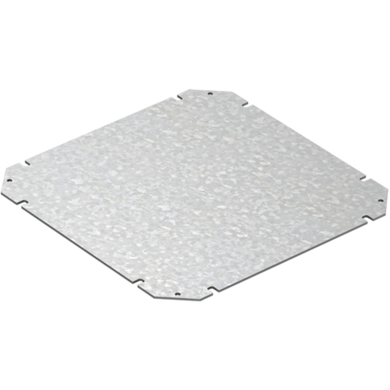 Mounting plate for GEOS series made of sheet steel, incl. fixing screws, for bottom mounting.
