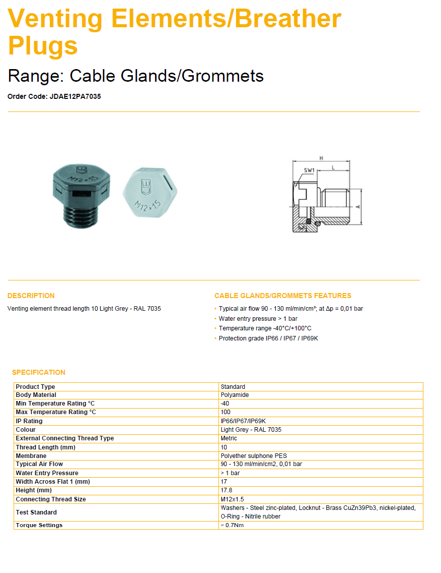 The JD series of venting plugs are designed to provide protection for hermetically sealed electronic enclosures. The design allows continuous ventilation and adaption of the inner enclosure pressure to prevent condensation build up whilst maintaining the IP rating of your enclosure. The venting plug can be installed using the locking nut supplied or we can machine a threaded hole into your enclosure, please contact us for machining pricing.