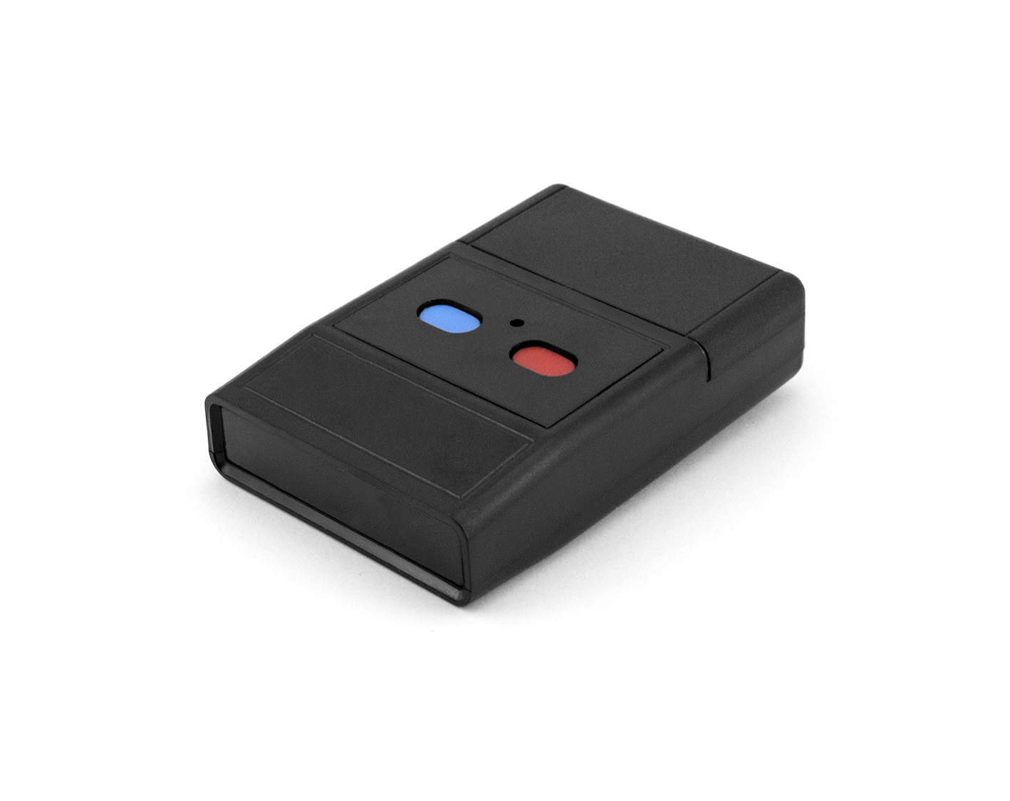 Small handheld remote control case moulded in black ABS material with two buttons (red and blue).
