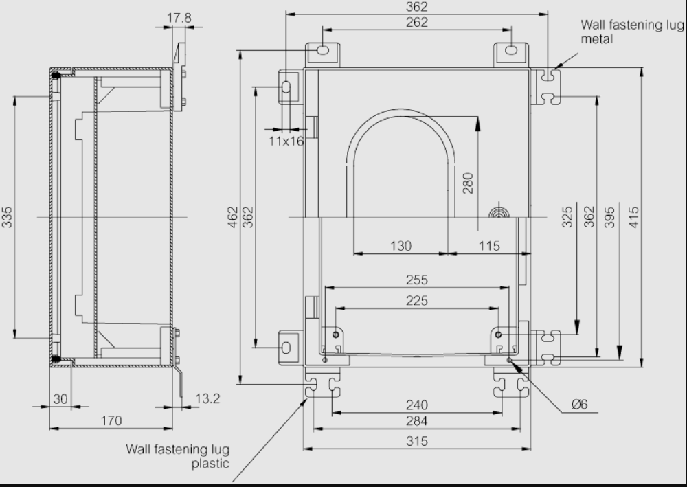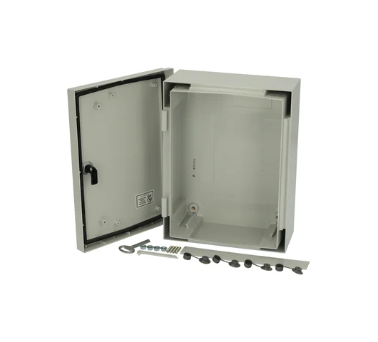 GRP cabinet enclosure – Including : Cabinet base. door with PUR gasket. 3mm double bit lock(s) with transport and plastic key. screws for mounting plate/DIN-rail and wall fastening lugs