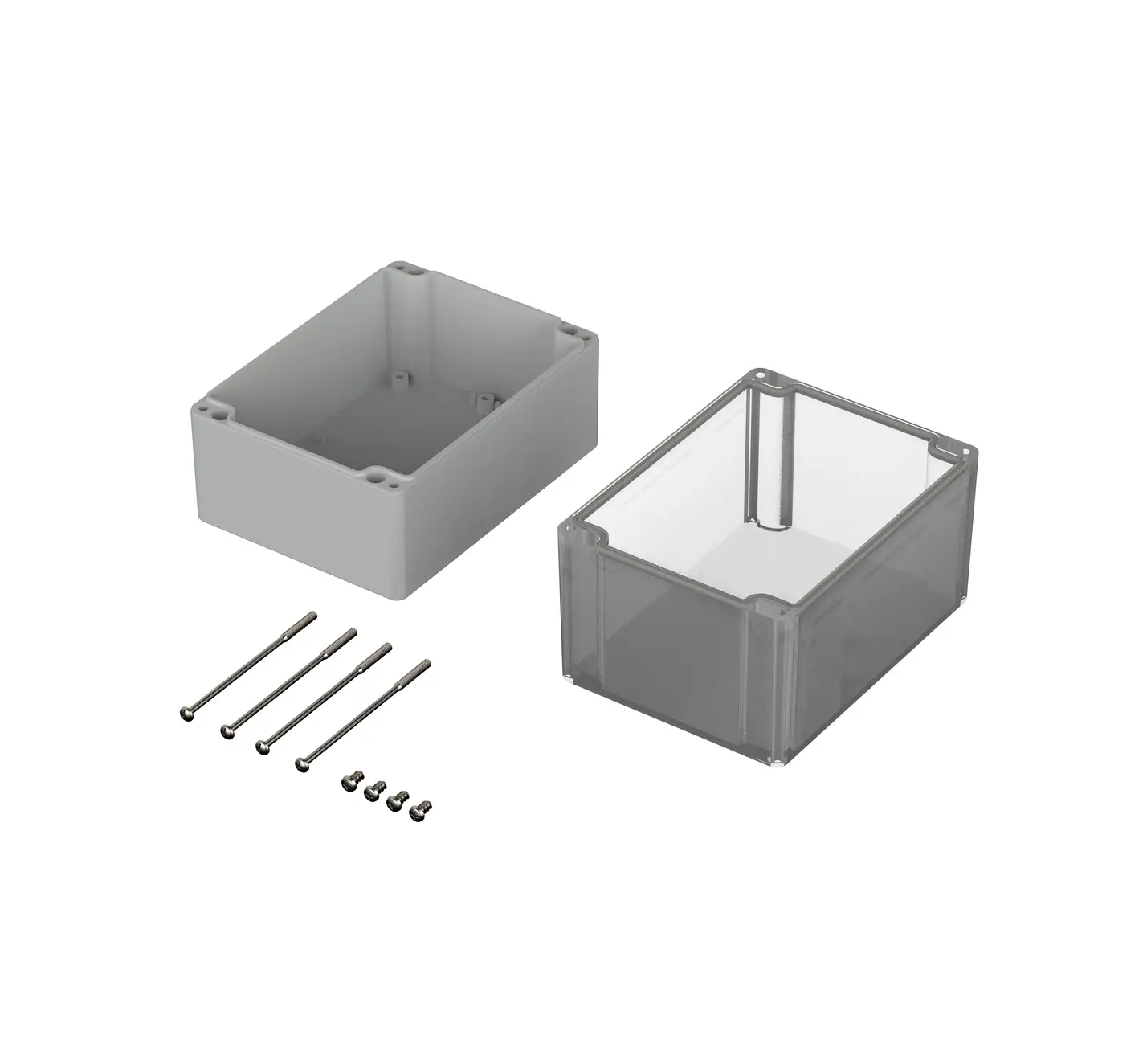 Internally there are mounting points designed to accommodate PCB, din rails and mounting plates. Wall mounting accessories are available to buy however there are existing mounting holes in the base of the enclosure that are situated outside of the sealed area and within the lid which allow for a concealed wall mounting option.