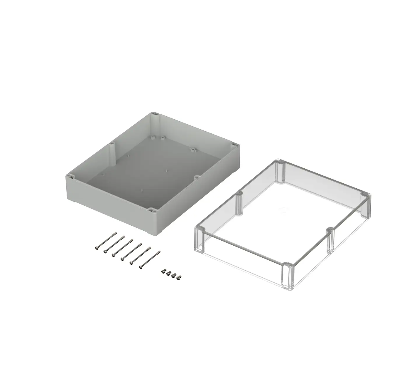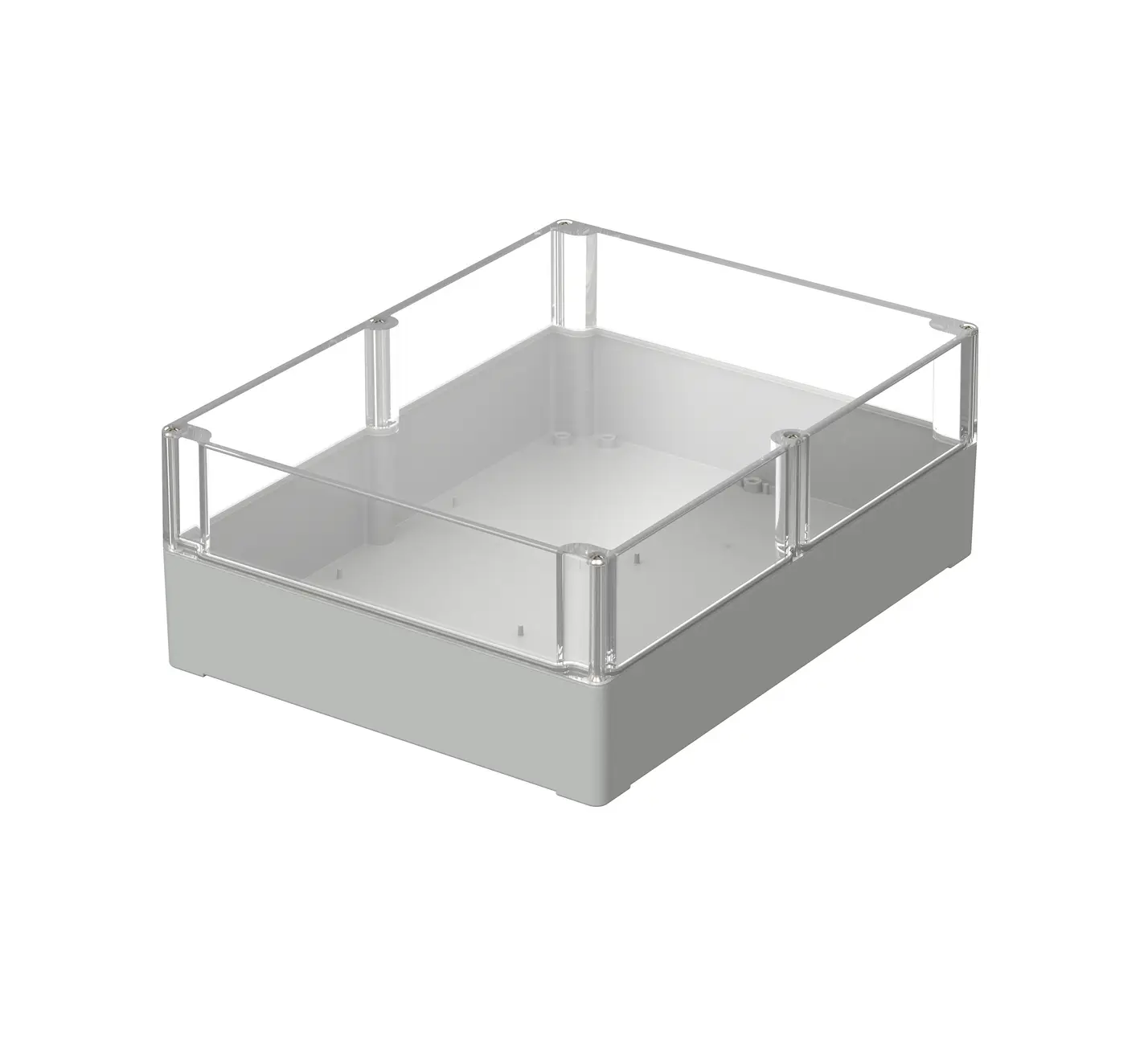 Internally there are mounting points designed to accommodate PCB, din rails and mounting plates. Wall mounting accessories are available to buy however there are existing mounting holes in the base of the enclosure that are situated outside of the sealed area and within the lid which allow for a concealed wall mounting option.