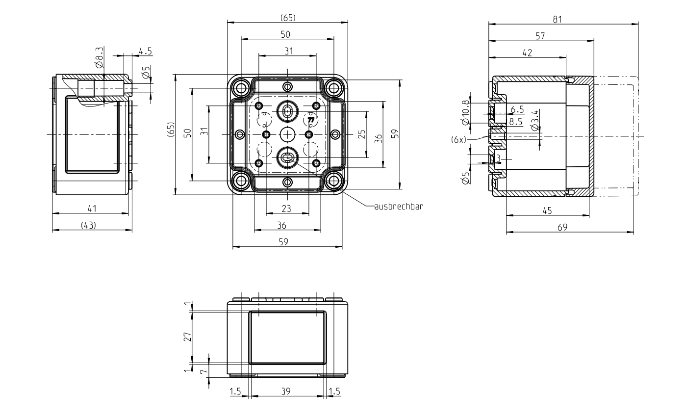IP66 Polystyrene Junction box without cable gland knockouts. Colour grey RAL 6018, top cover is opaque grey