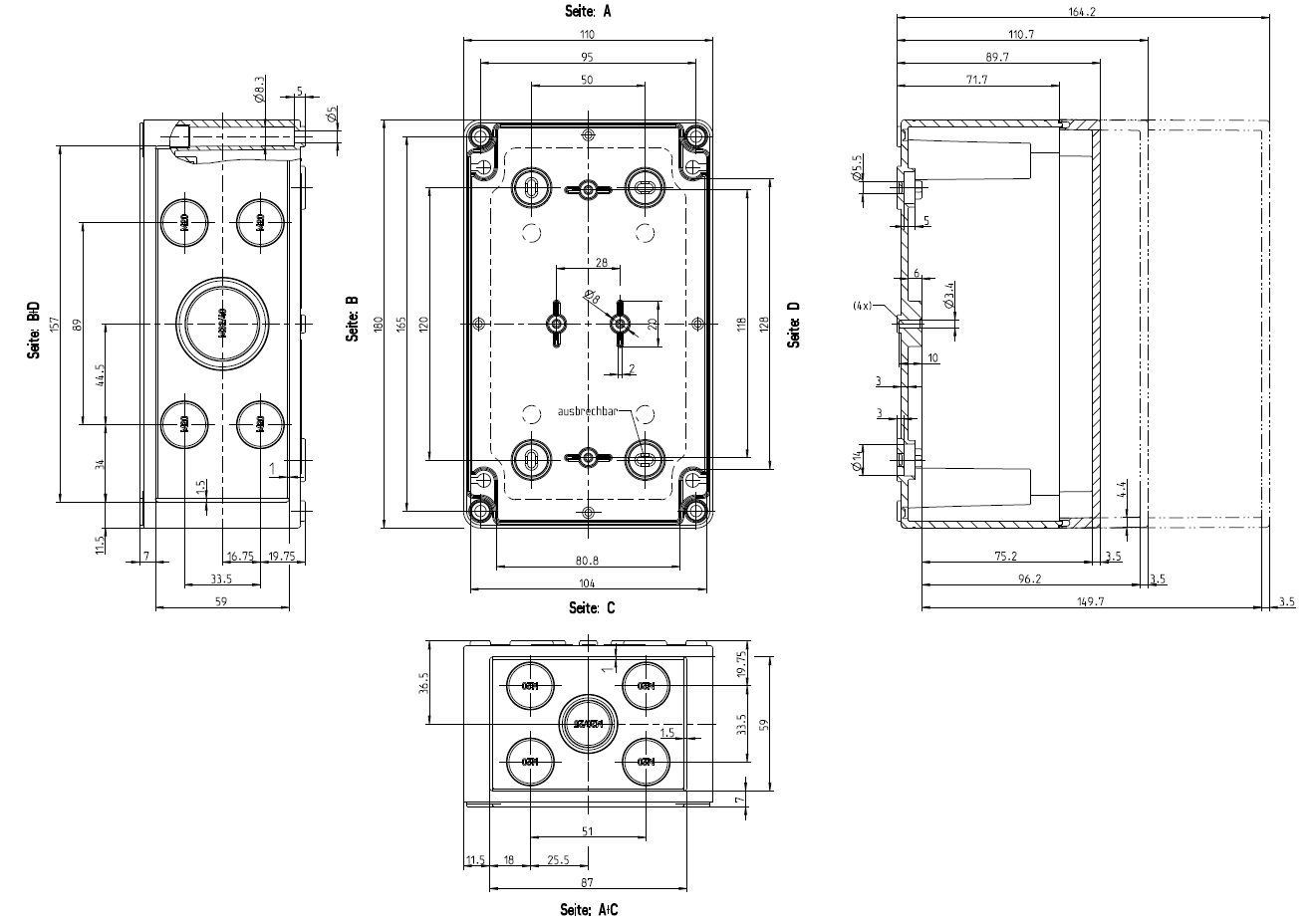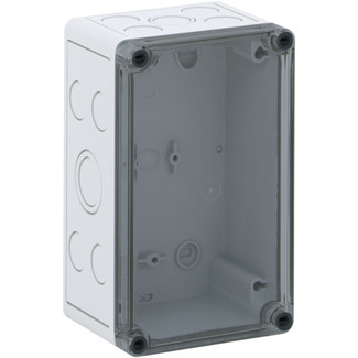 IP66 Polycarbonate Junction box with metric cable gland knockouts 2 x M20/25 2 x M32/40 16 x M20. colour grey RAL 6018, top cover is transparent