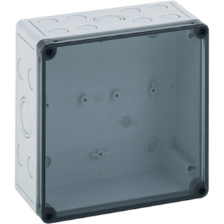 IP66 Polycarbonate Junction box with metric cable gland knockouts 4 x M32/40 24 x M20. colour grey RAL 6018, top cover is transparent
