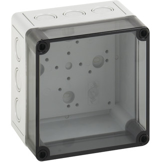 IP66 Polycarbonate Junction box with metric cable gland knockouts 2 x M20 7 x M25/32. colour grey RAL 6018, top cover is transparent