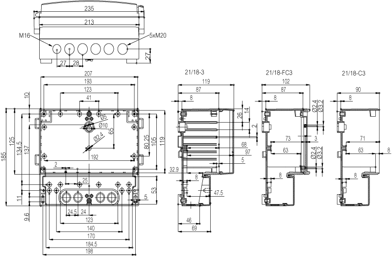 Wall mounted case, IP65 rated with clear front hinged cover, material ABS, colour grey. Polycarbonate version available order code PC 21/18-3