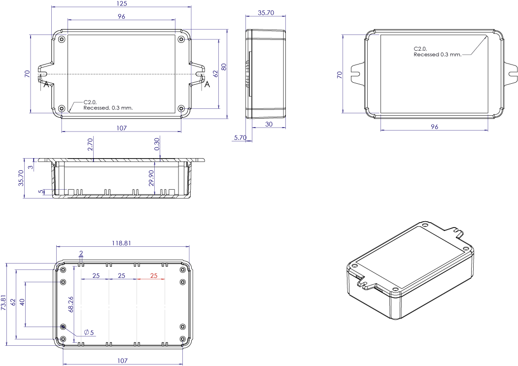This flanged enclosure benefits from PCB mounts in both the lid and base as well as slots in the base of the enclosure to secure further PCB.