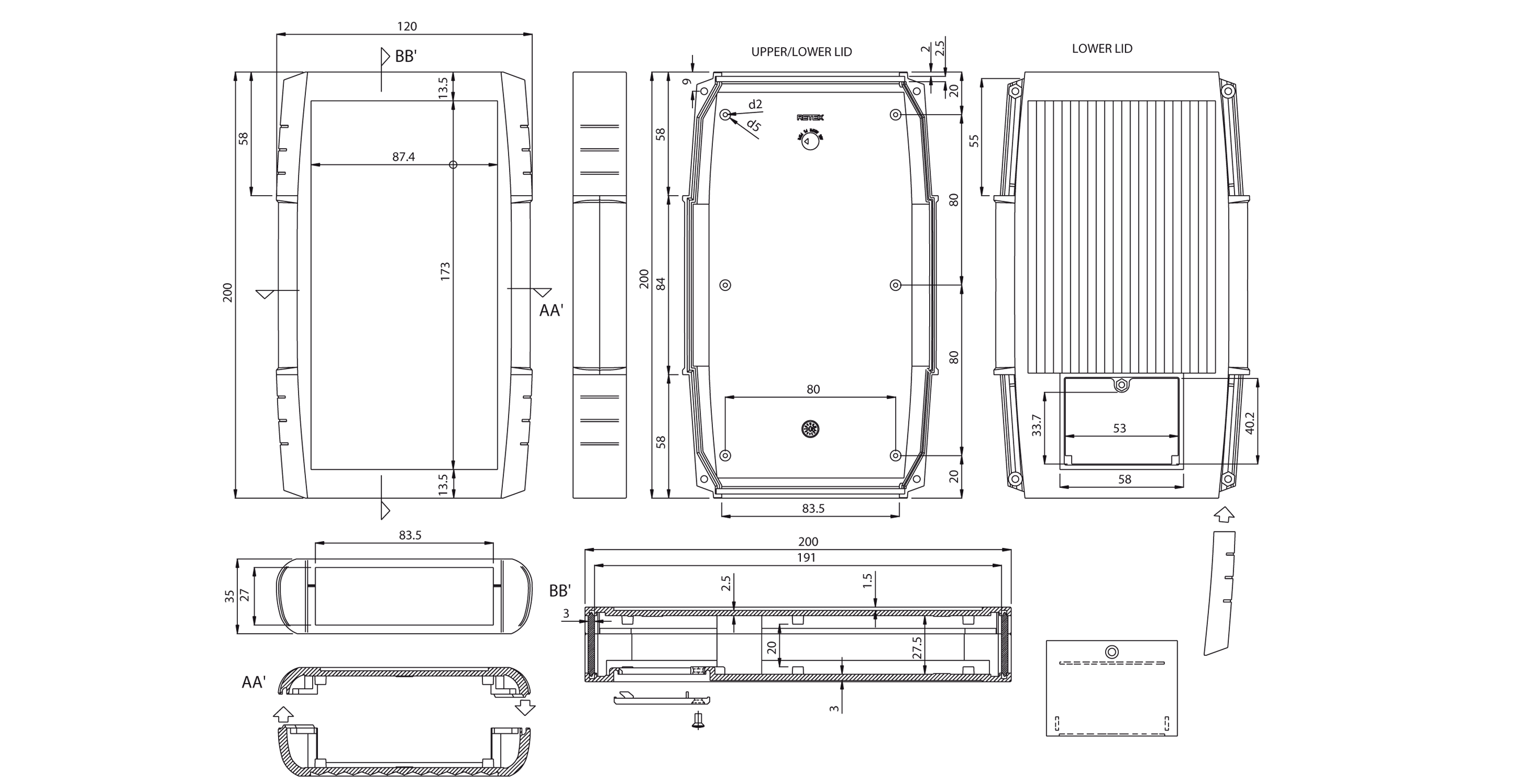 The case itself is moulded in high impact ABS material and is resistant to temperatures up to 85ºC. The enclosure can be sealed to IP65 using the optional sealing gasket. Each end of the enclosure has a removable panel to allow easy machining and addition of controls/LED’s and the lid and base both feature PCB mounts.