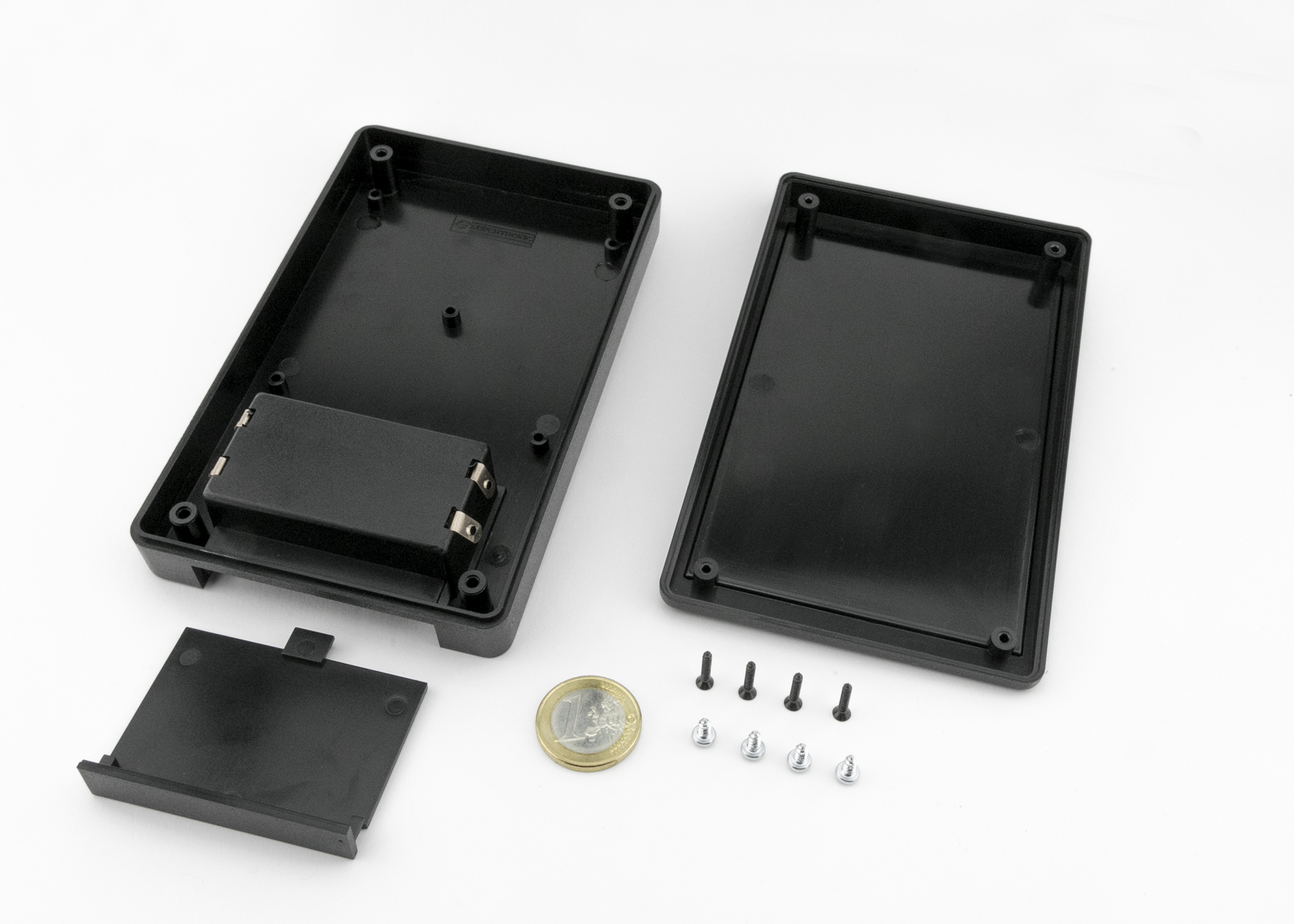 Medium hand held case with stylised half moon effect recessed top 110 x 73mm in black or grey, battery compartment for 2x AA, material ABS. LOW COST MACHINING.This product can be machined to your specifications at the point of manufacture.Contact us for details.