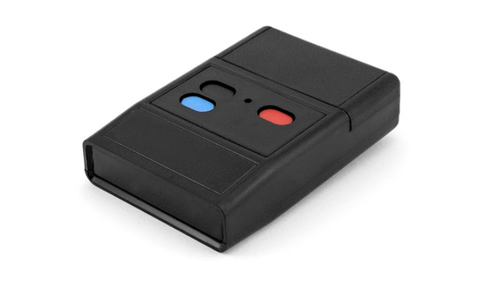 Small handheld remote control case moulded in black ABS material with three buttons (red, blue and black)