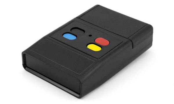 Small handheld remote control case moulded in black ABS material with four buttons (red, blue, yellow and black).