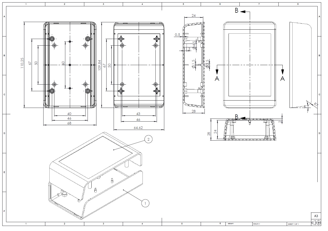 Internally there are PCB mounts in the lid and base section to maximise the usable space and a recessed area on the lid can be utilised for membranes and labels.