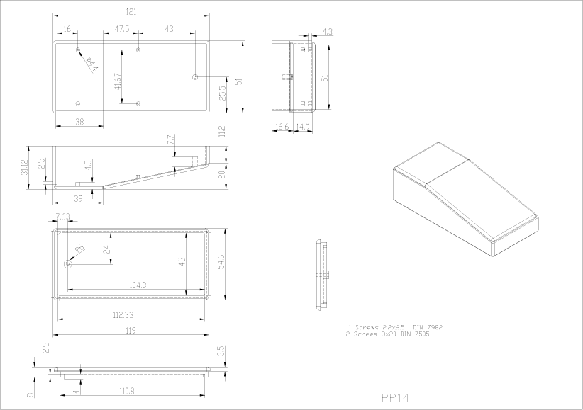 Small sloping desk top case held together with one screw, internal PCB mounts, black, ABS, sloping front, front 18 mm rear 35 mm.LOW COST MACHINING.This product can be machined to your specifications at the point of manufacture. Contact us for details.
