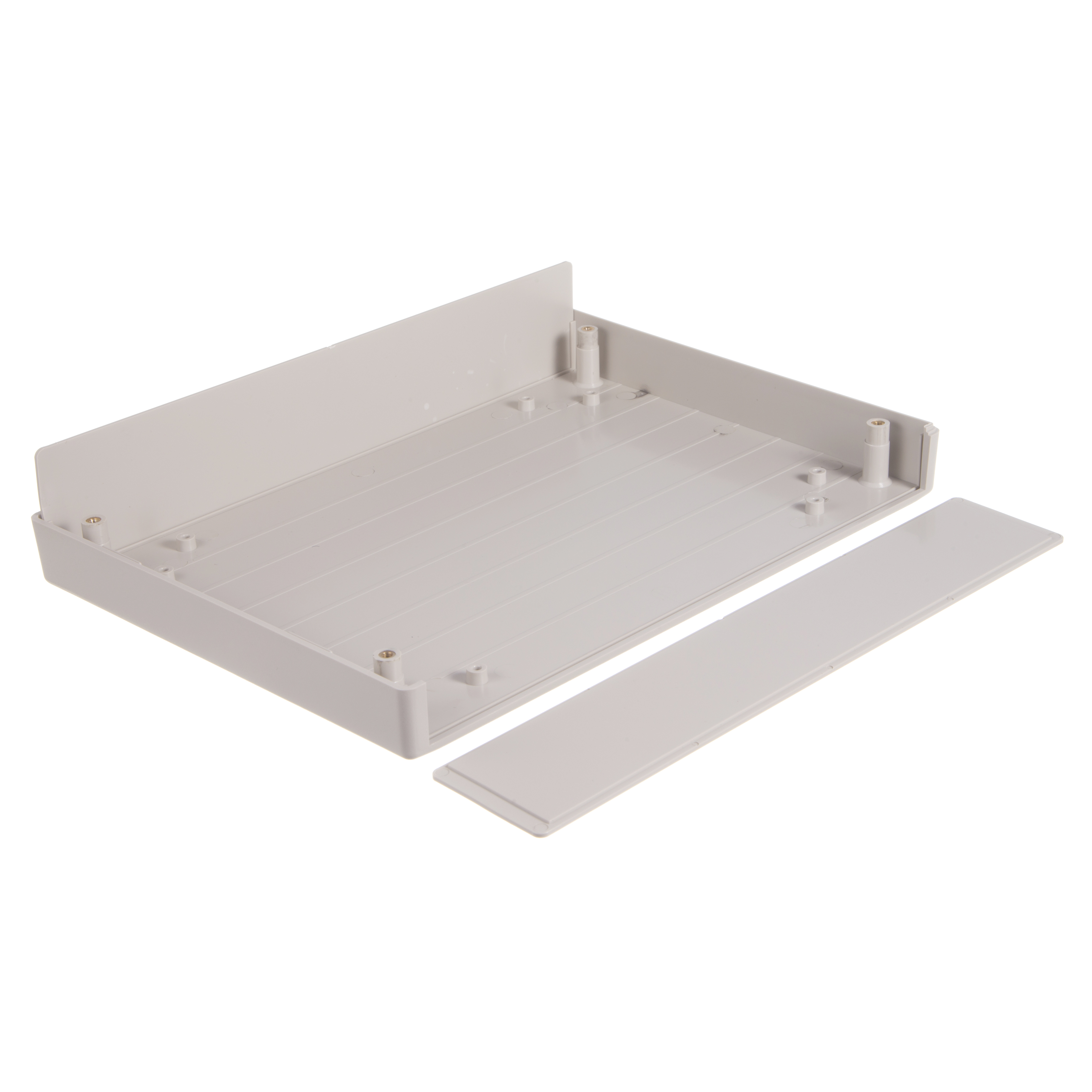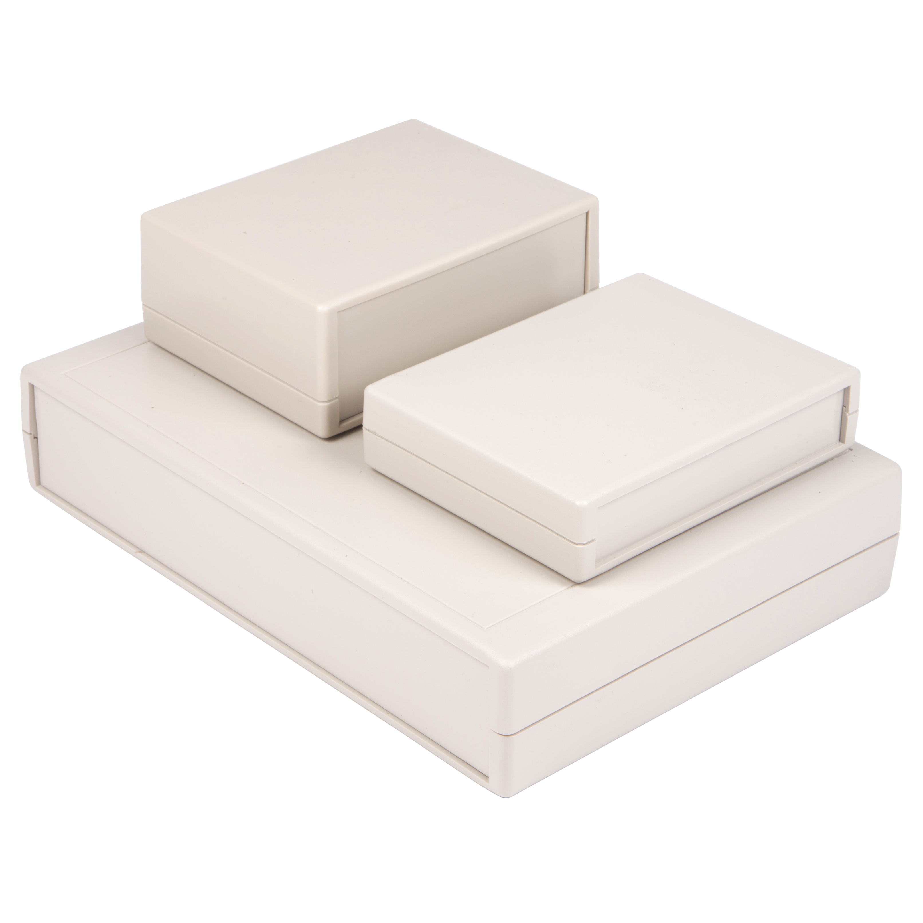 They are moulded in light grey ABS HB material and feature PCB mounts in the lid and base of the enclosure.