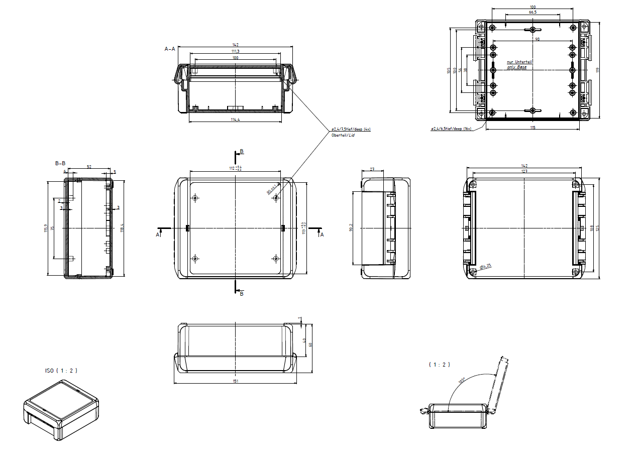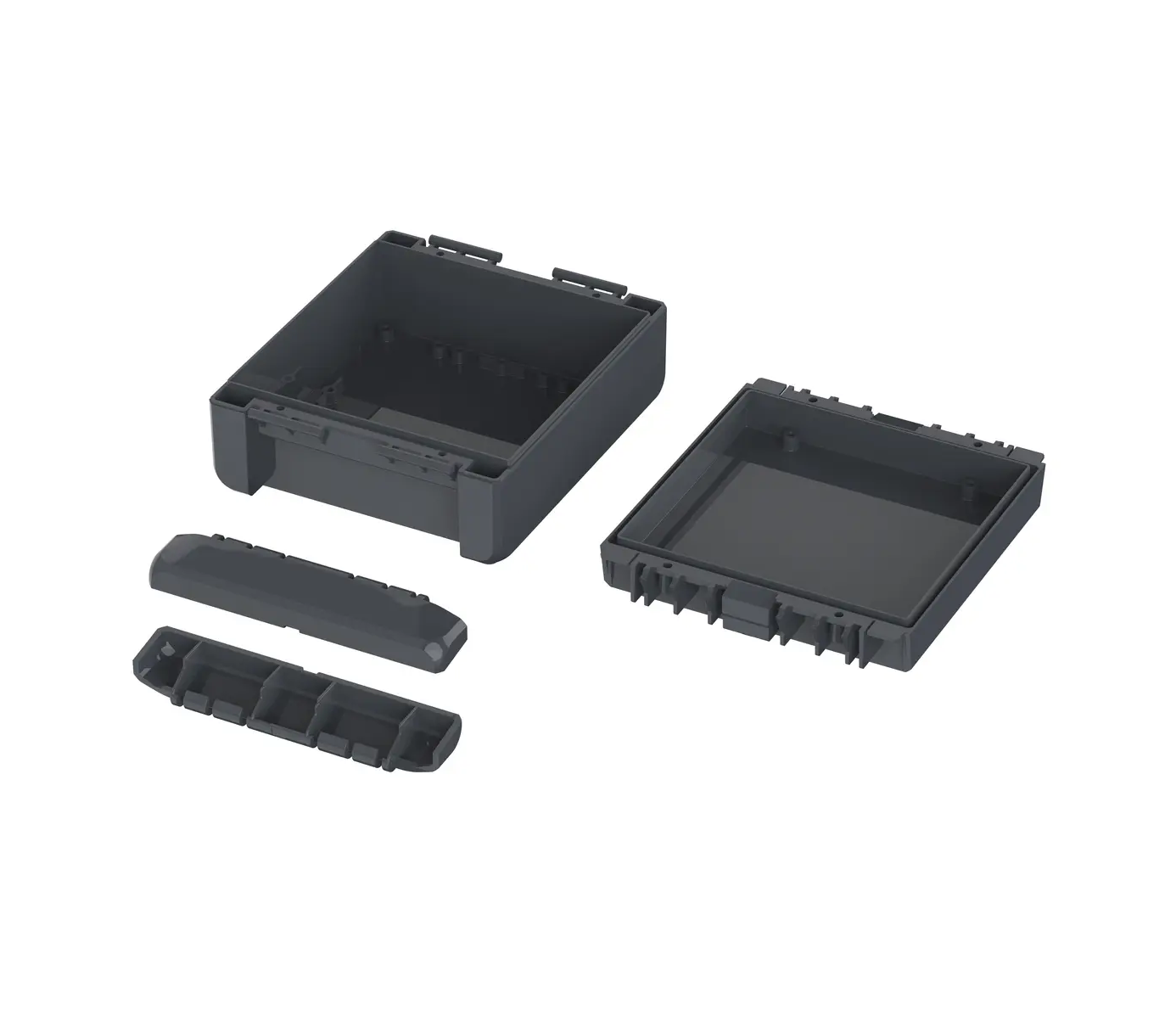 The enclosure compromises a base, lid and two catches which clip to the lid and base to seal the enclosure. These catches effortlessly clip into place and allow the lid to be hinged, they also conceal the screw fixing points to further secure the enclosure. Once the clips are in position the Bocube can offer ingress protection up to IP68 capable of submersion to 1.2  meters up to two hours.