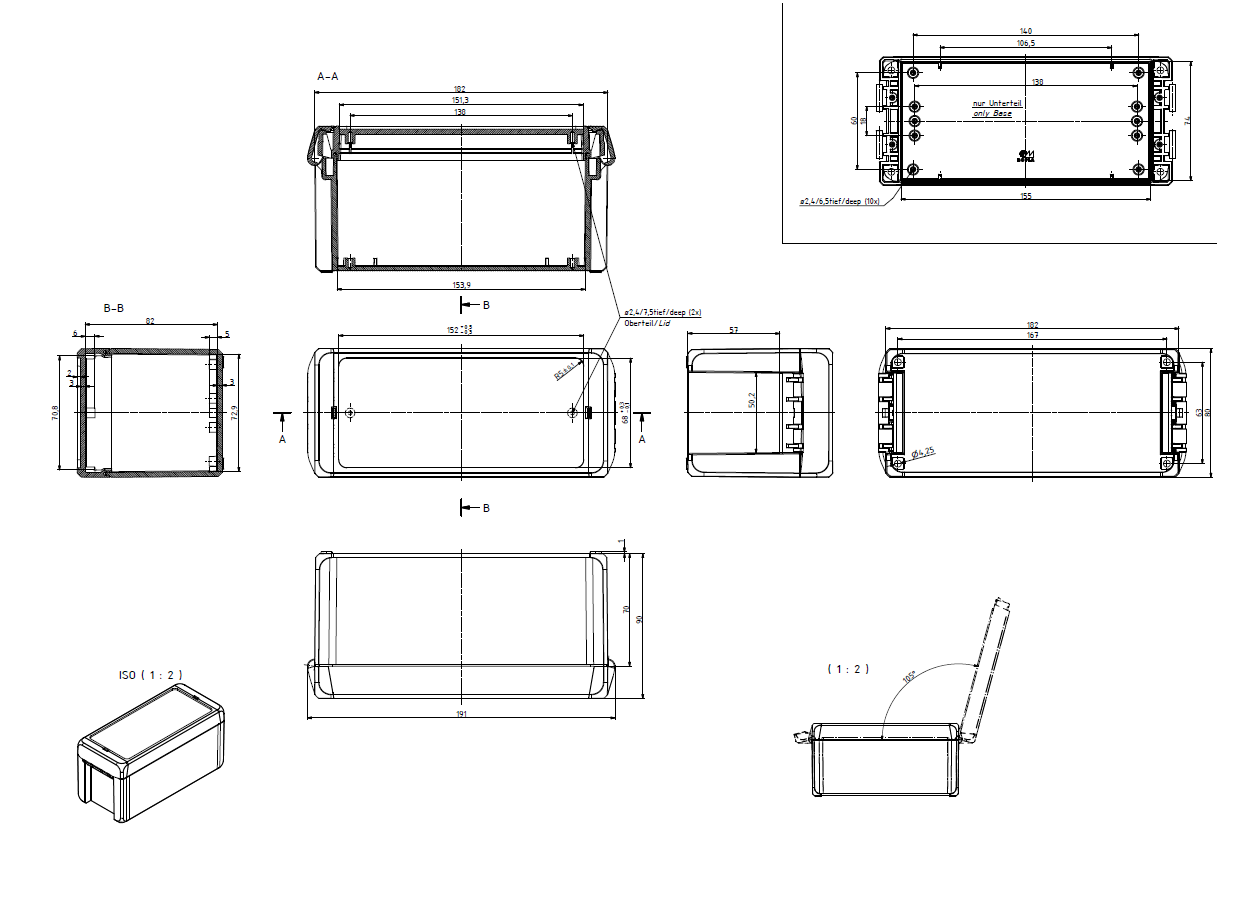 The enclosure compromises a base, lid and two catches which clip to the lid and base to seal the enclosure. These catches effortlessly clip into place and allow the lid to be hinged, they also conceal the screw fixing points to further secure the enclosure. Once the clips are in position the Bocube can offer ingress protection up to IP68 capable of submersion to 1.2 meters up to two hours.