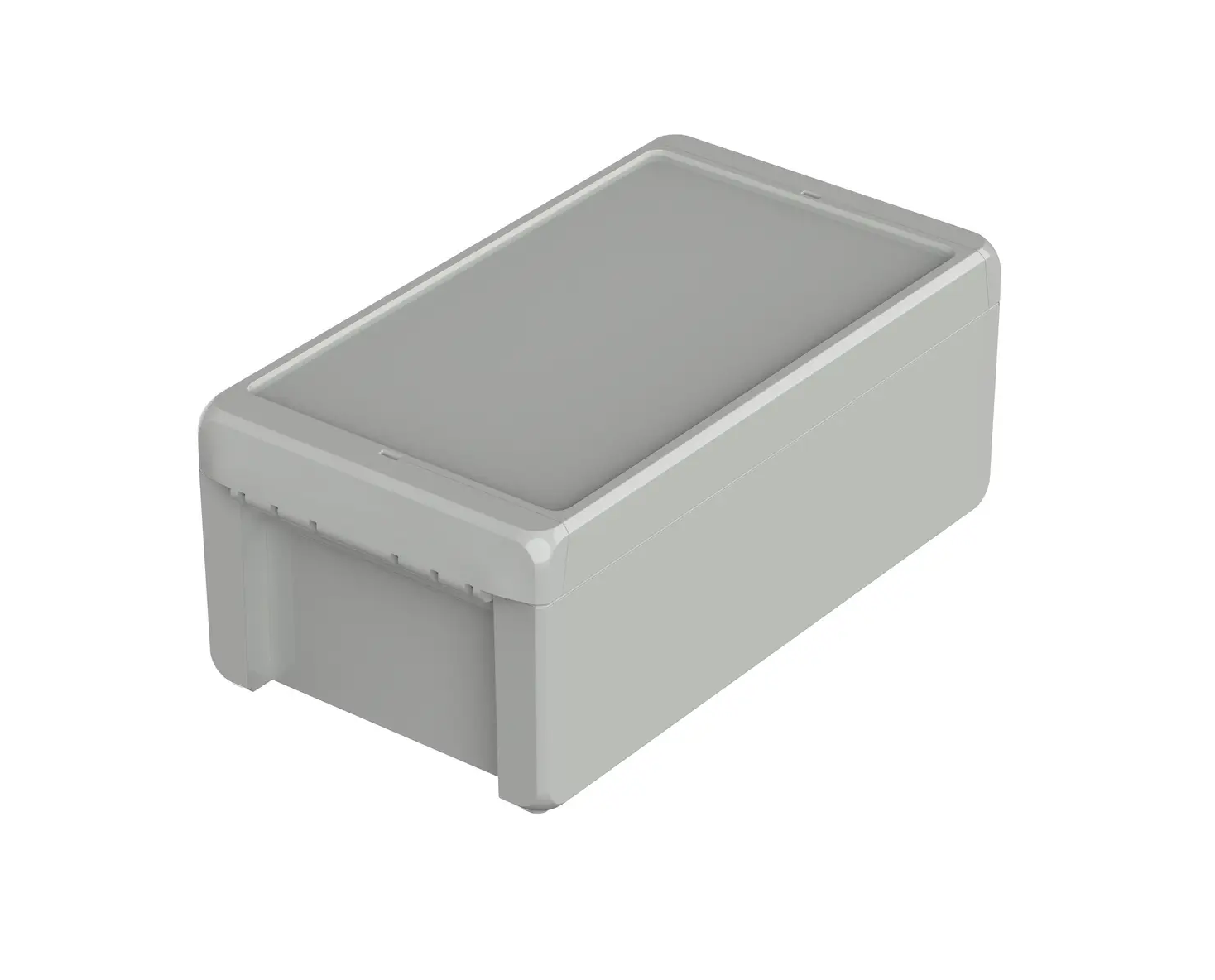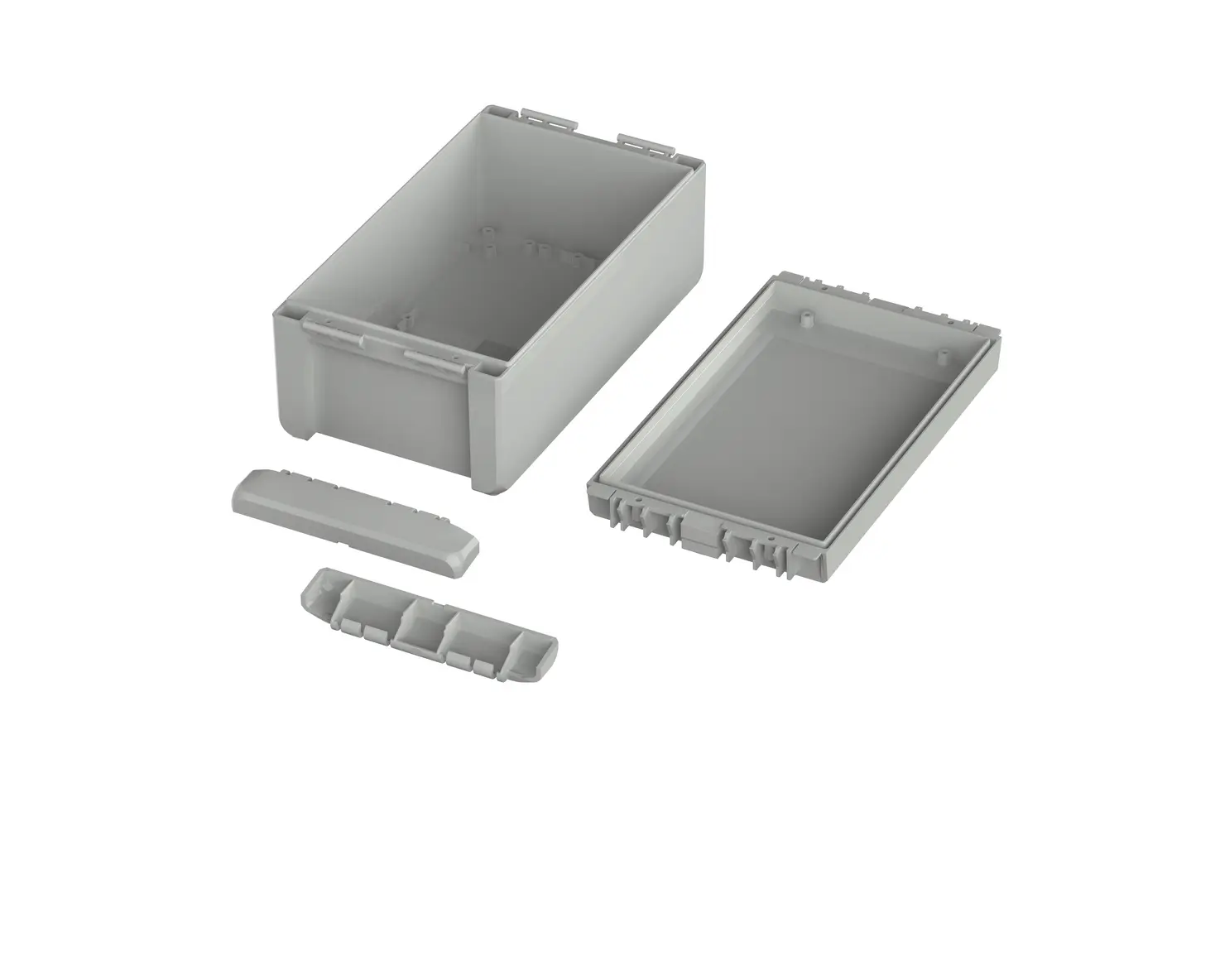 The enclosure compromises a base, lid and two catches which clip to the lid and base to seal the enclosure. These catches effortlessly clip into place and allow the lid to be hinged, they also conceal the screw fixing points to further secure the enclosure. Once the clips are in position the Bocube can offer ingress protection up to IP68 capable of submersion to 1.2  meters up to two hours.