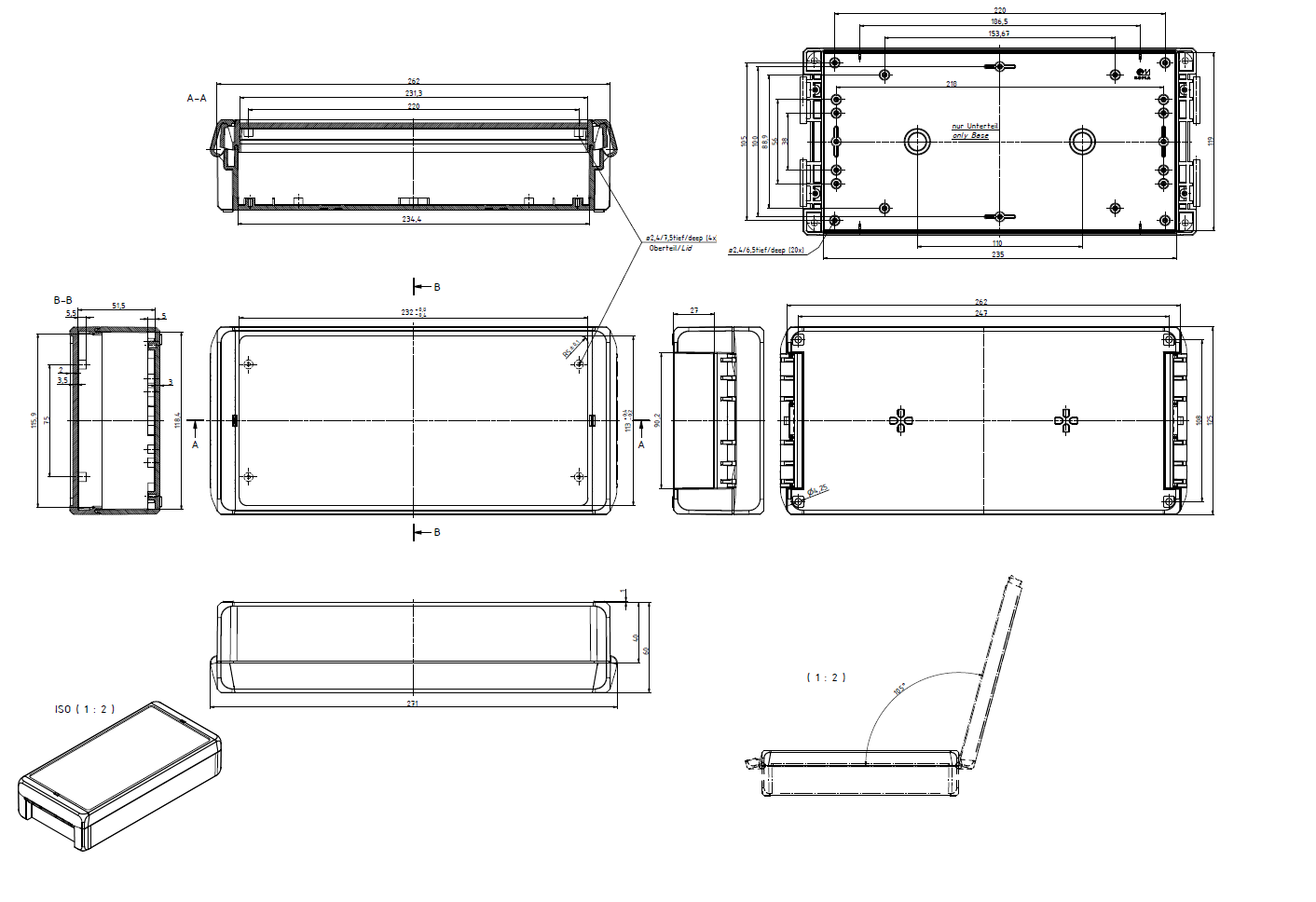 The enclosure compromises a base, lid and two catches which clip to the lid and base to seal the enclosure. These catches effortlessly clip into place and allow the lid to be hinged, they also conceal the screw fixing points to further secure the enclosure. Once the clips are in position the Bocube can offer ingress protection up to IP68 capable of submersion to 1.2 meters up to two hours.