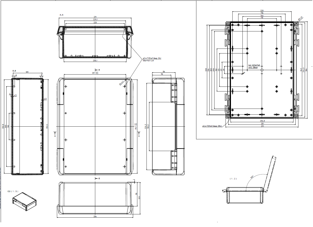 The enclosure compromises a base, lid and two catches which clip to the lid and base to seal the enclosure. These catches effortlessly clip into place and allow the lid to be hinged, they also conceal the screw fixing points to further secure the enclosure. Once the clips are in position the Bocube can offer ingress protection up to IP68 capable of submersion to 1.2 meters up to two hours.