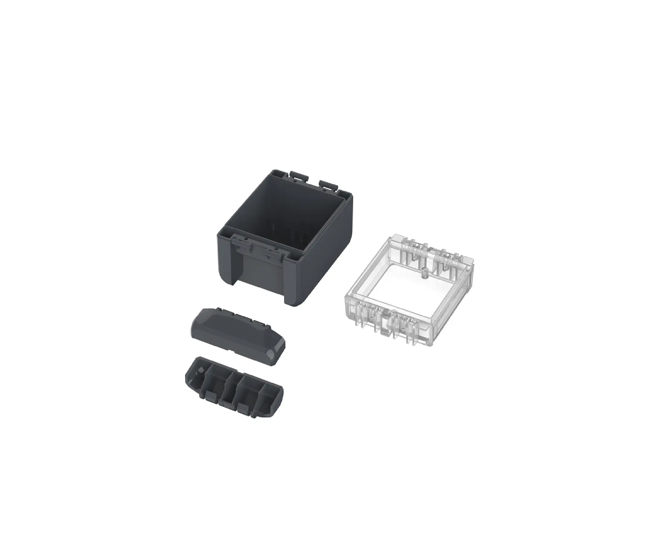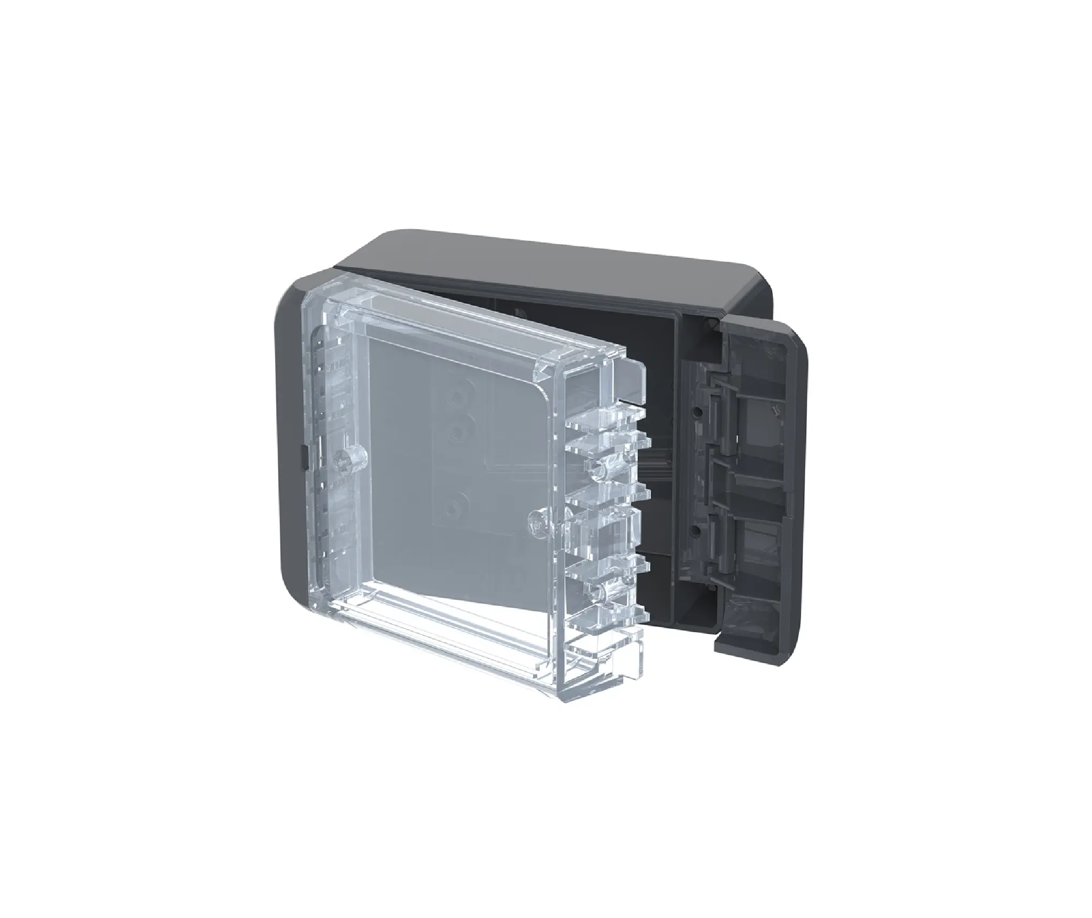 The enclosure compromises a base, lid and two catches which clip to the lid and base to seal the enclosure. These catches effortlessly clip into place and allow the lid to be hinged, they also conceal the screw fixing points to further secure the enclosure. Once the clips are in position the Bocube can offer ingress protection up to IP68 capable of submersion to 1.2 meters up to two hours.