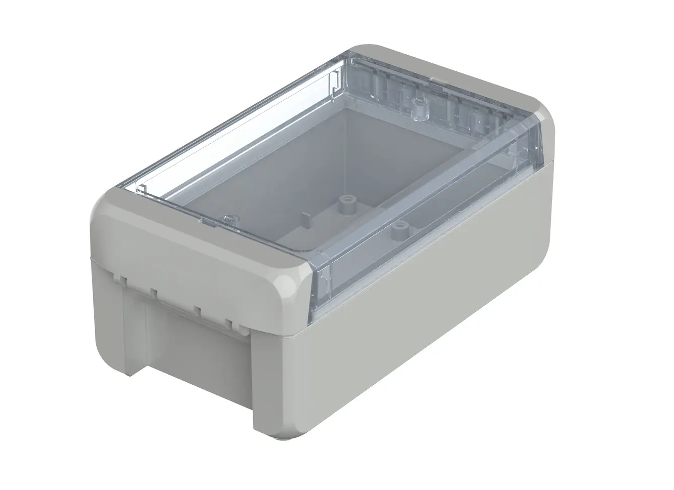 The enclosure compromises a base, lid and two catches which clip to the lid and base to seal the enclosure. These catches effortlessly clip into place and allow the lid to be hinged, they also conceal the screw fixing points to further secure the enclosure. Once the clips are in position the Bocube can offer ingress protection up to IP68 capable of submersion to 1.2 meters up to two hours.