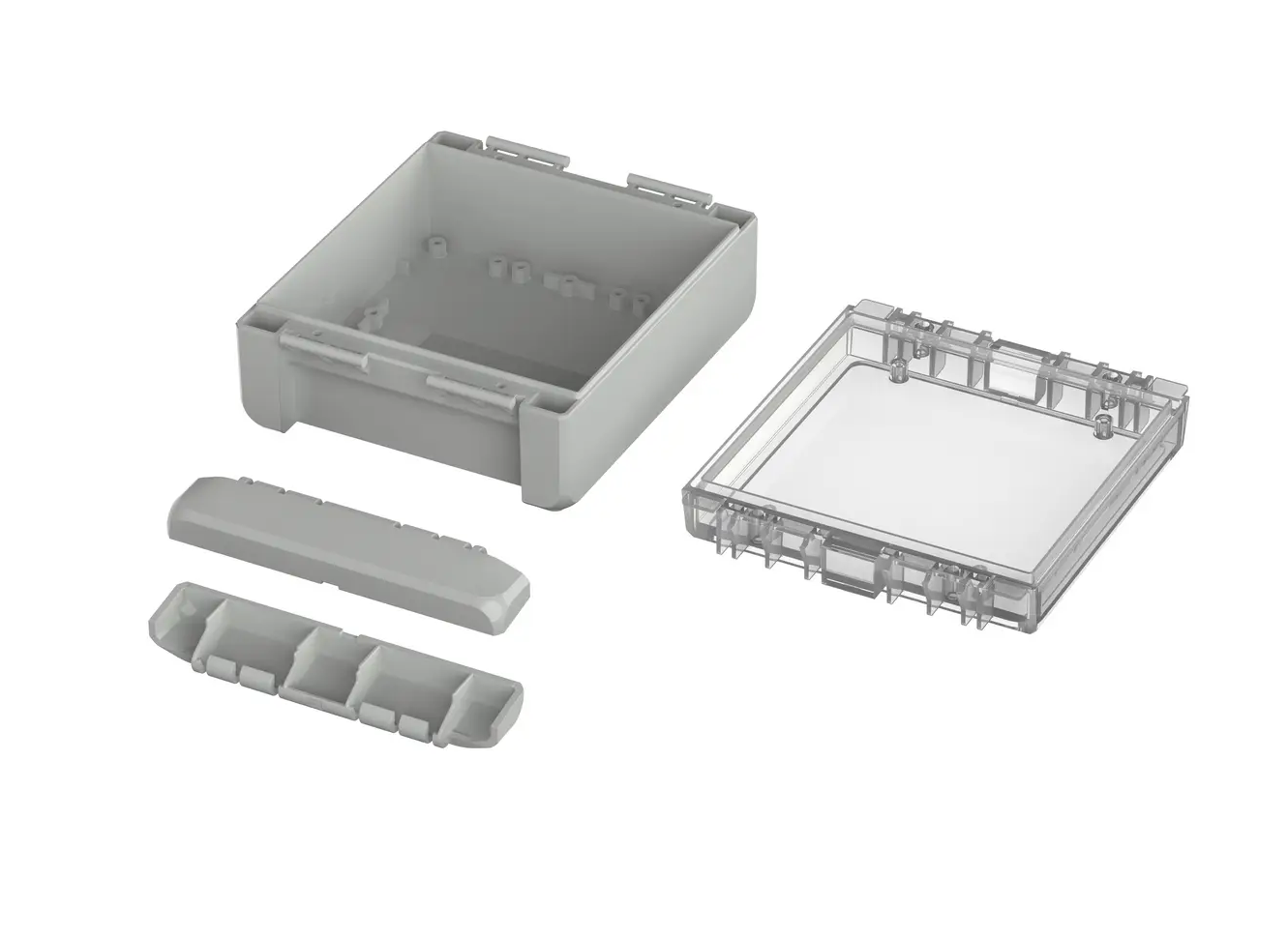 The enclosure compromises a base, lid and two catches which clip to the lid and base to seal the enclosure. These catches effortlessly clip into place and allow the lid to be hinged, they also conceal the screw fixing points to further secure the enclosure. Once the clips are in position the Bocube can offer ingress protection up to IP68 capable of submersion to 1.2  meters up to two hours.