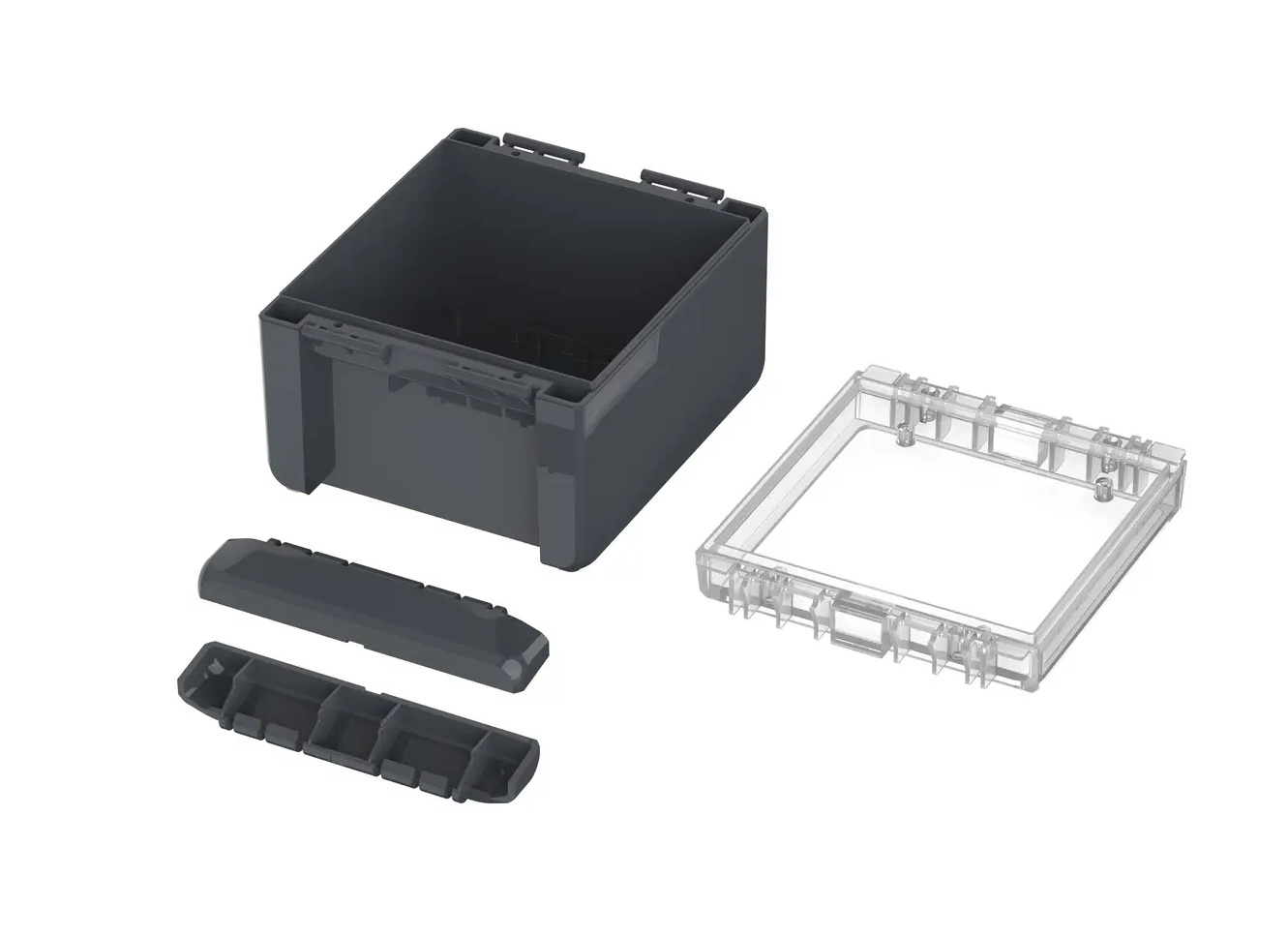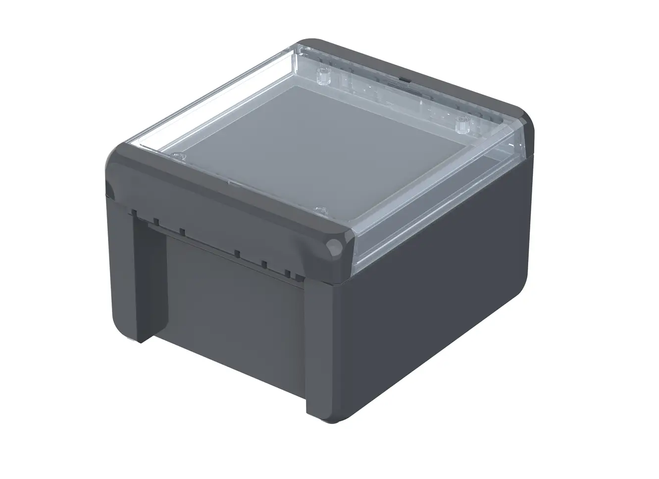 The enclosure compromises a base, lid and two catches which clip to the lid and base to seal the enclosure. These catches effortlessly clip into place and allow the lid to be hinged, they also conceal the screw fixing points to further secure the enclosure. Once the clips are in position the Bocube can offer ingress protection up to IP68 capable of submersion to 1.2  meters up to two hours.