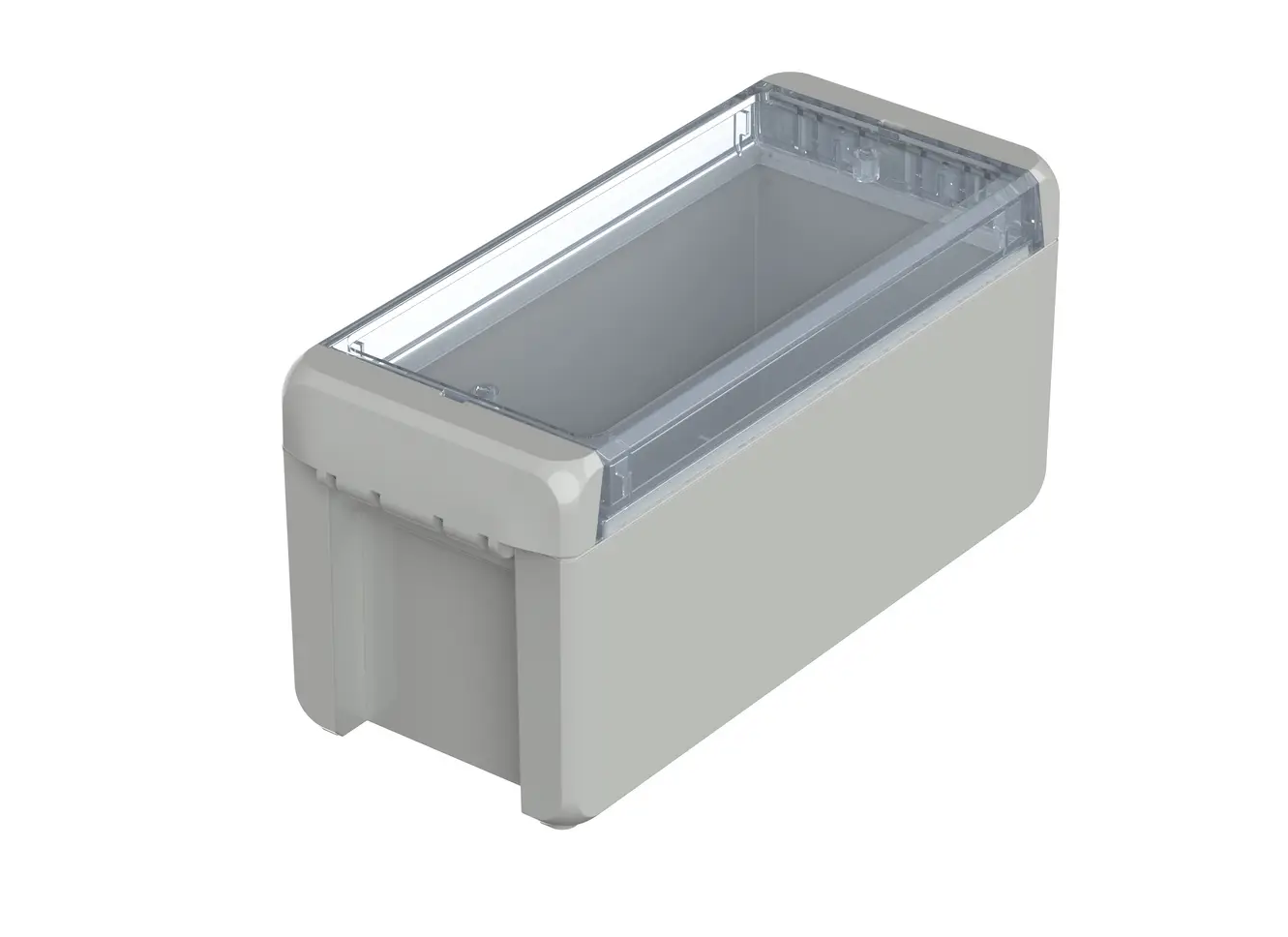 The enclosure compromises a base, lid and two catches which clip to the lid and base to seal the enclosure. These catches effortlessly clip into place and allow the lid to be hinged, they also conceal the screw fixing points to further secure the enclosure. Once the clips are in position the Bocube can offer ingress protection up to IP68 capable of submersion to 1.2 meters up to two hours.