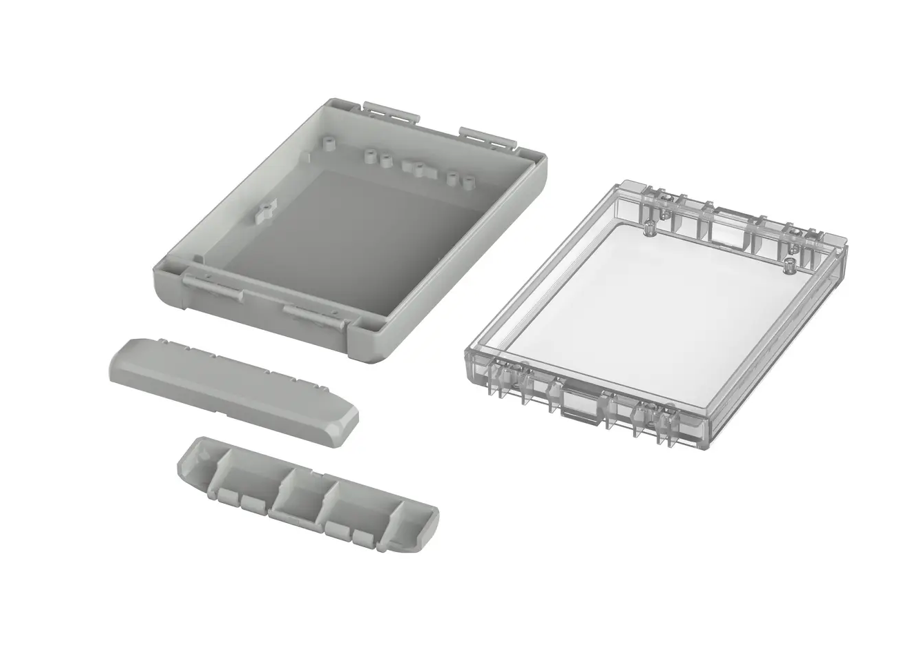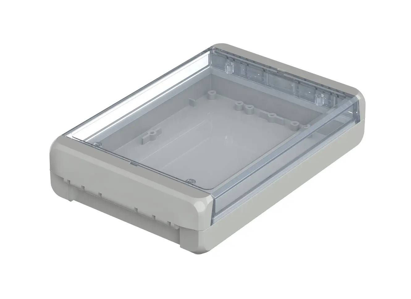 The enclosure compromises a base, lid and two catches which clip to the lid and base to seal the enclosure. These catches effortlessly clip into place and allow the lid to be hinged, they also conceal the screw fixing points to further secure the enclosure. Once the clips are in position the Bocube can offer ingress protection up to IP68 capable of submersion to 1.2  meters up to two hours.