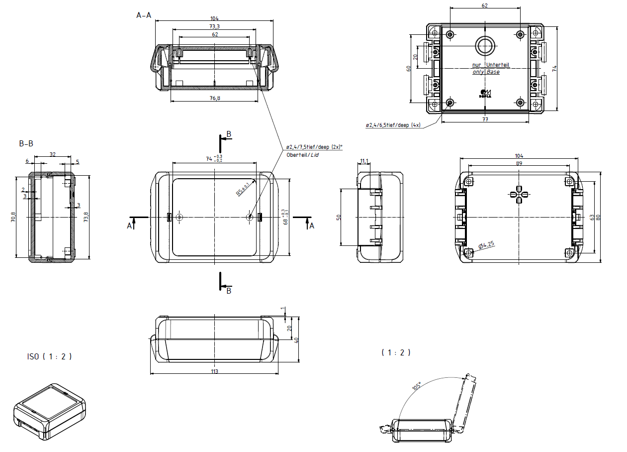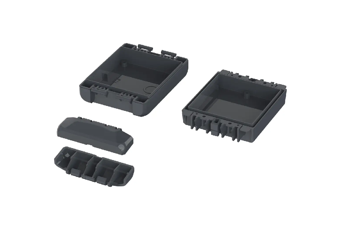 The enclosure compromises a base, lid and two catches which clip to the lid and base to seal the enclosure. These catches effortlessly clip into place and allow the lid to be hinged, they also conceal the screw fixing points to further secure the enclosure. Once the clips are in position the Bocube can offer ingress protection up to IP68 capable of submersion to 1.2  meters up to two hours.