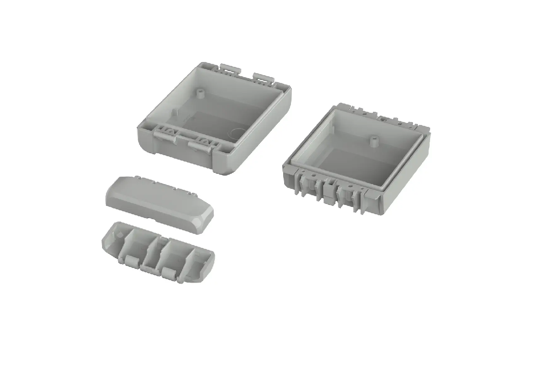 The enclosure compromises a base, lid and two catches which clip to the lid and base to seal the enclosure. These catches effortlessly clip into place and allow the lid to be hinged, they also conceal the screw fixing points to further secure the enclosure. Once the clips are in position the Bocube can offer ingress protection up to IP68 capable of submersion to 1.2 meters up to two hours.