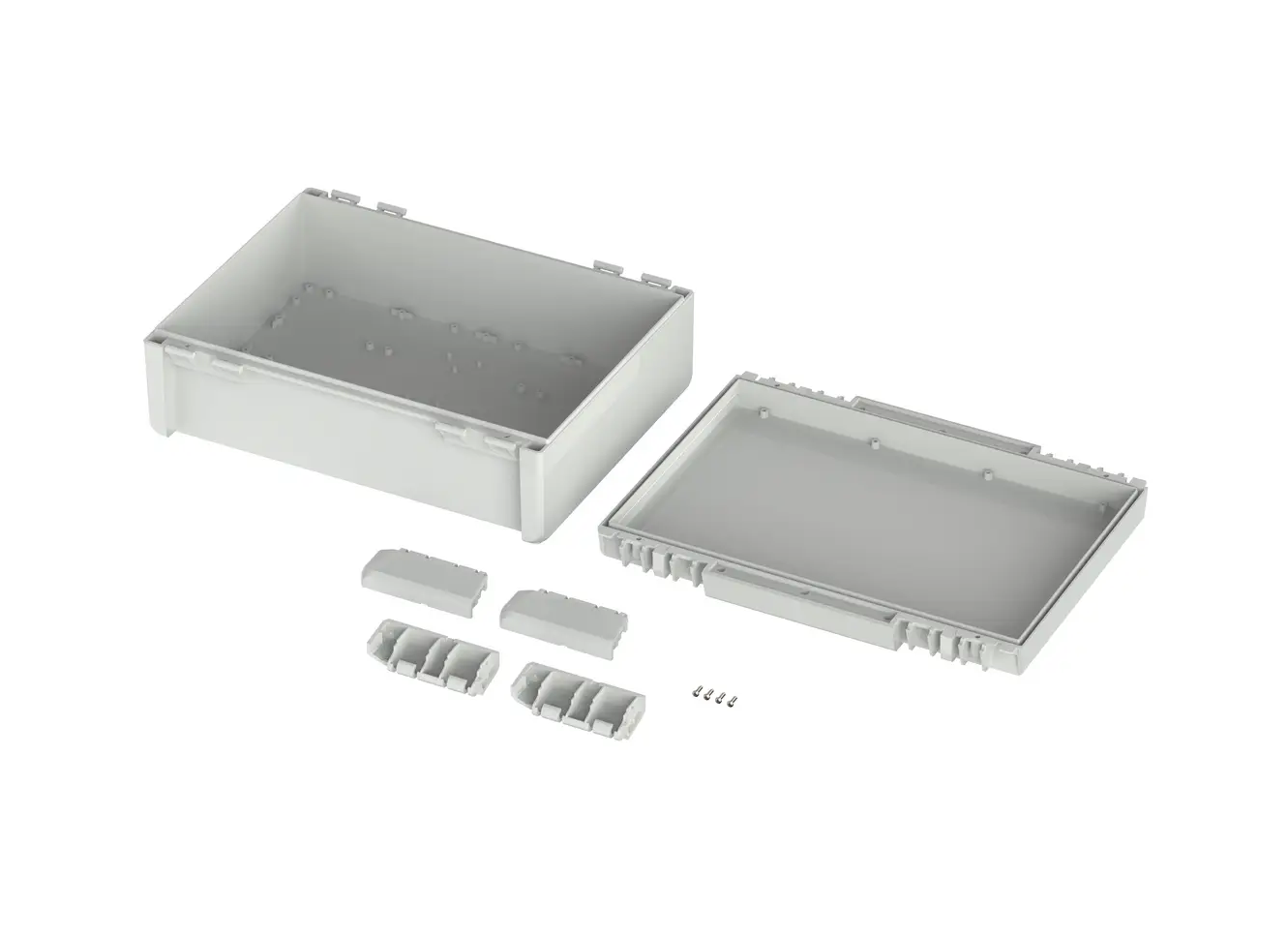 The enclosure compromises a base, lid and two catches which clip to the lid and base to seal the enclosure. These catches effortlessly clip into place and allow the lid to be hinged, they also conceal the screw fixing points to further secure the enclosure. Once the clips are in position the Bocube can offer ingress protection up to IP68 capable of submersion to 1.2  meters up to two hours.