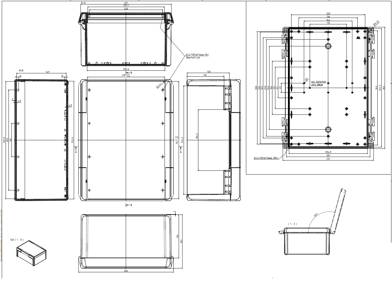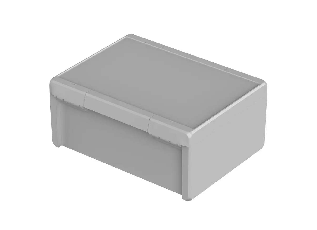 The enclosure compromises a base, lid and two catches which clip to the lid and base to seal the enclosure. These catches effortlessly clip into place and allow the lid to be hinged, they also conceal the screw fixing points to further secure the enclosure. Once the clips are in position the Bocube can offer ingress protection up to IP68 capable of submersion to 1.2 meters up to two hours.