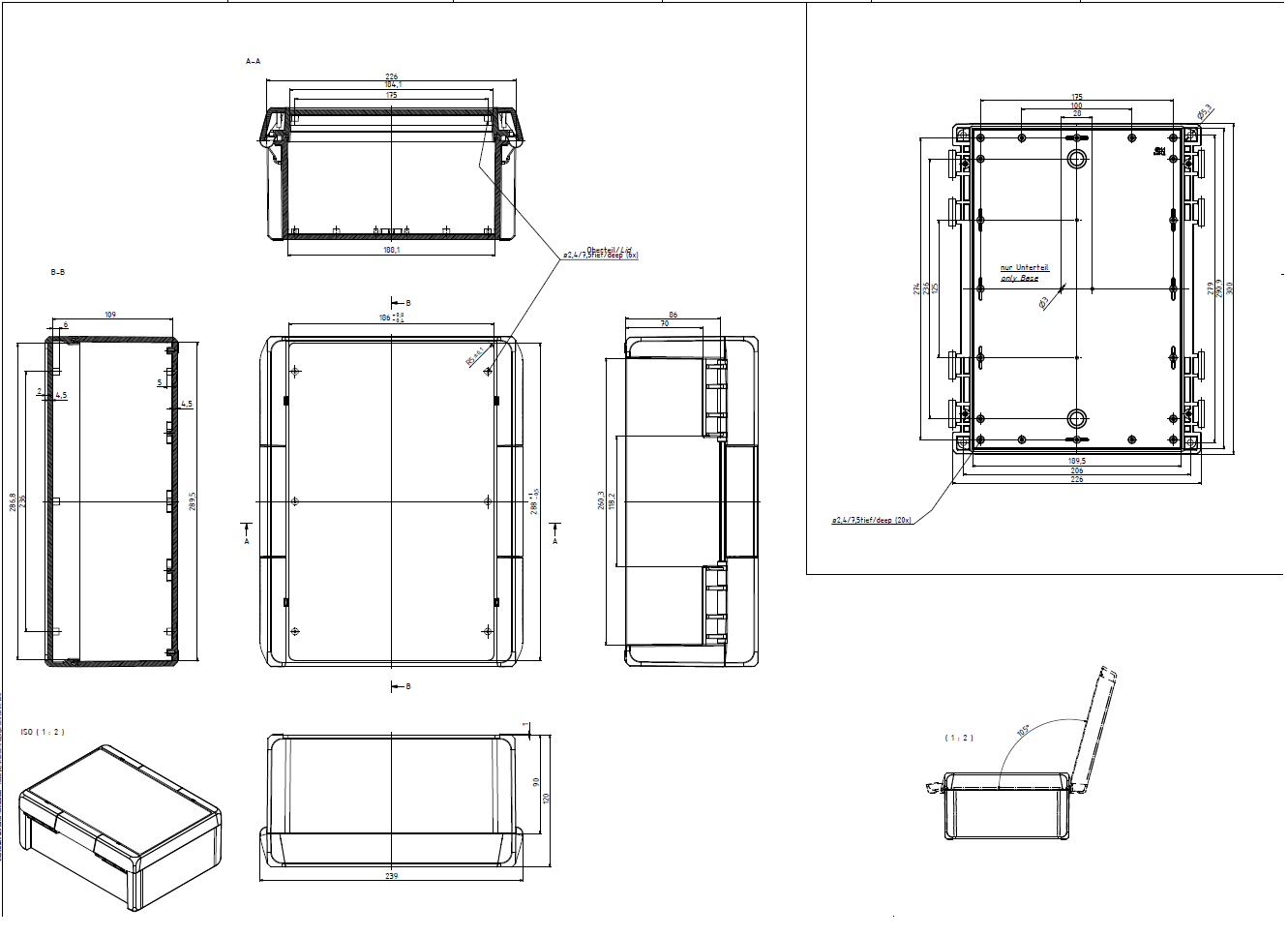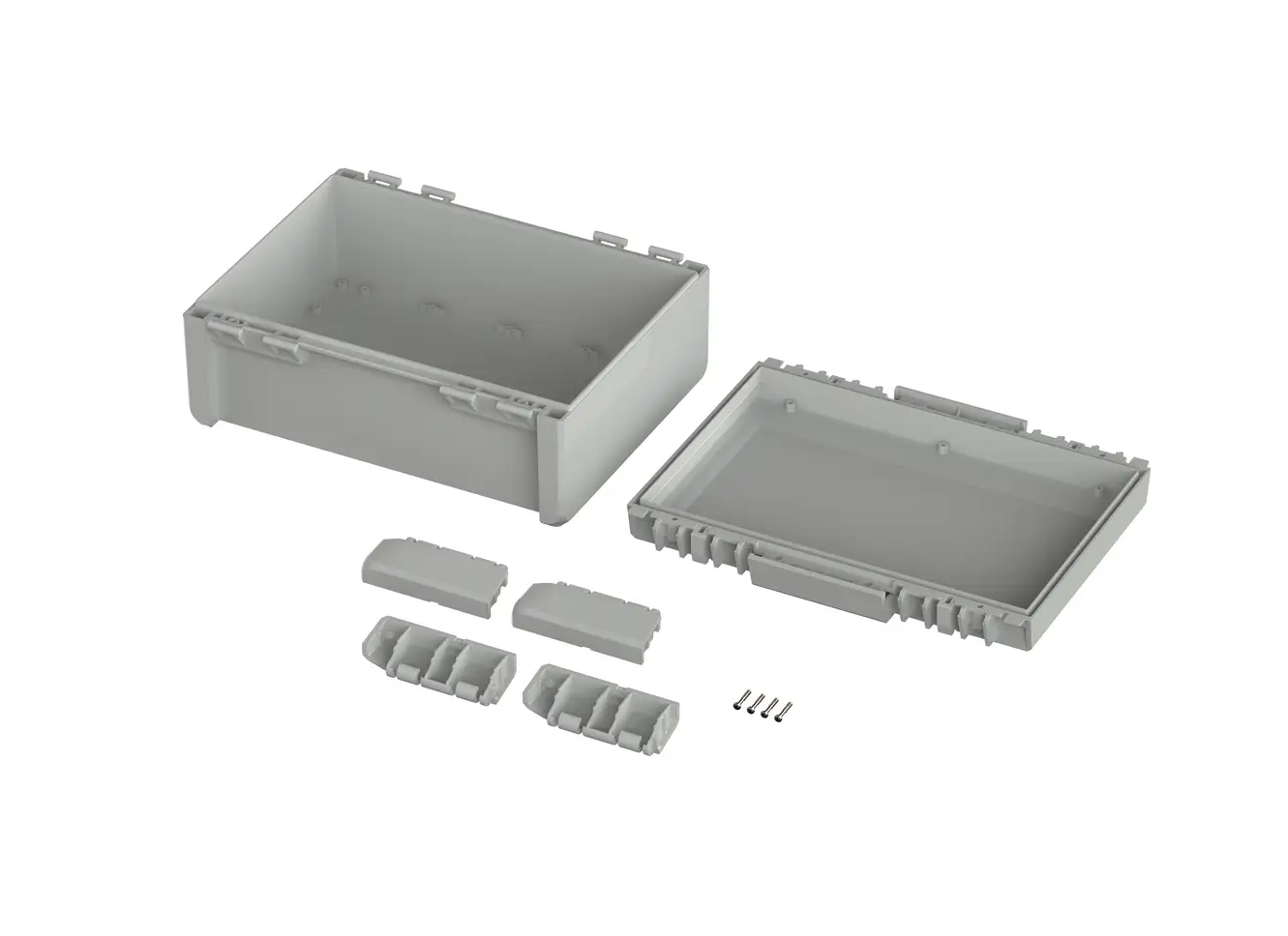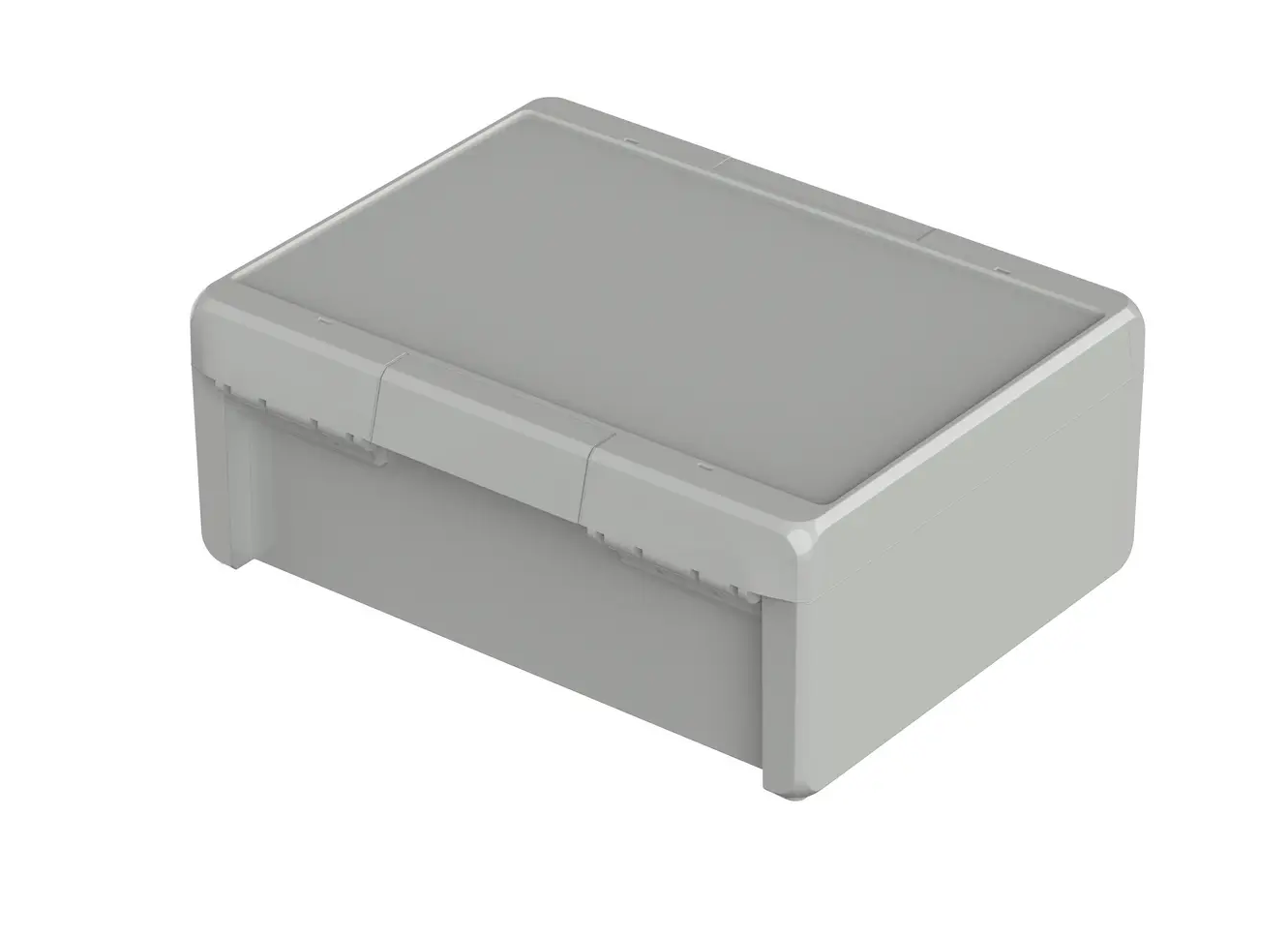 The enclosure compromises a base, lid and two catches which clip to the lid and base to seal the enclosure. These catches effortlessly clip into place and allow the lid to be hinged, they also conceal the screw fixing points to further secure the enclosure. Once the clips are in position the Bocube can offer ingress protection up to IP68 capable of submersion to 1.2  meters up to two hours.