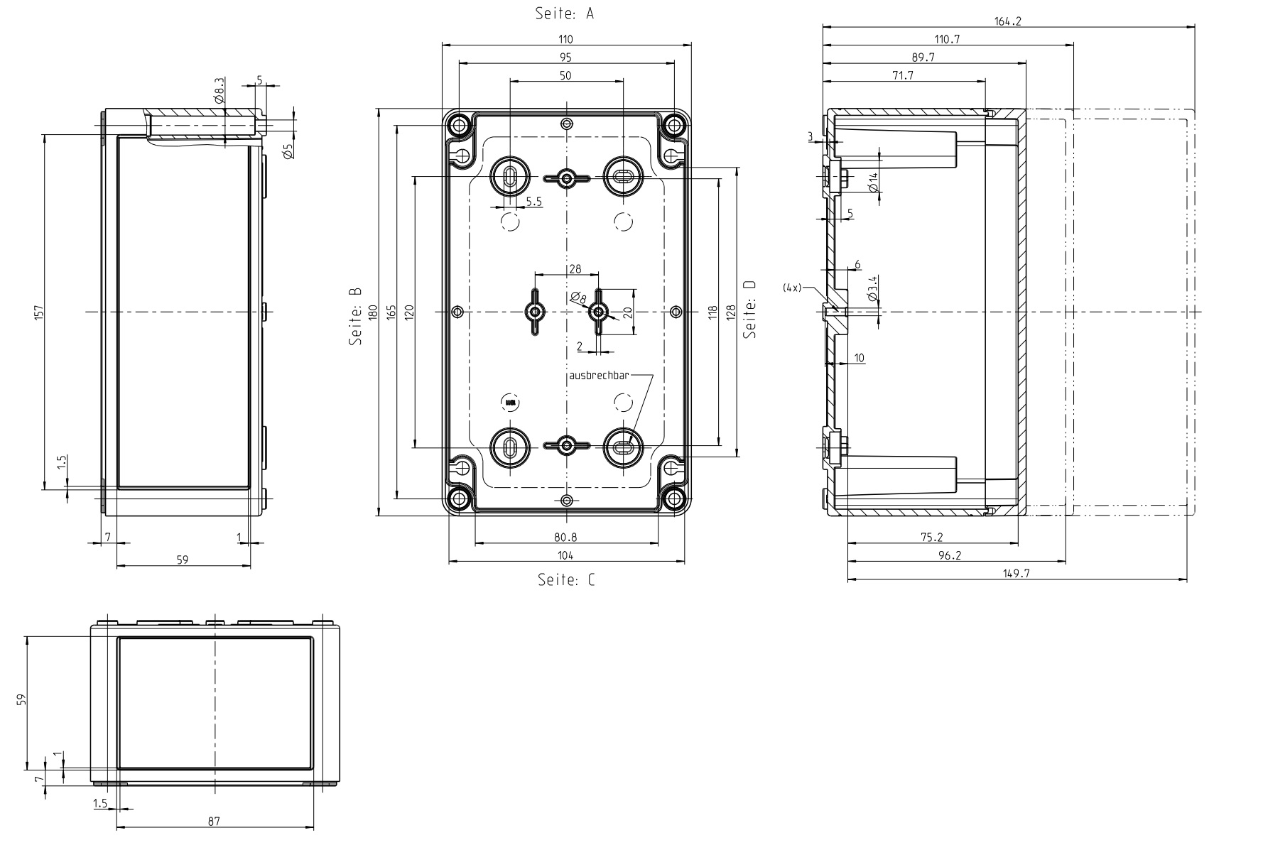 IP66 Polycarbonate Junction box without cable gland knockouts. colour grey RAL 6018, top cover is opaque grey