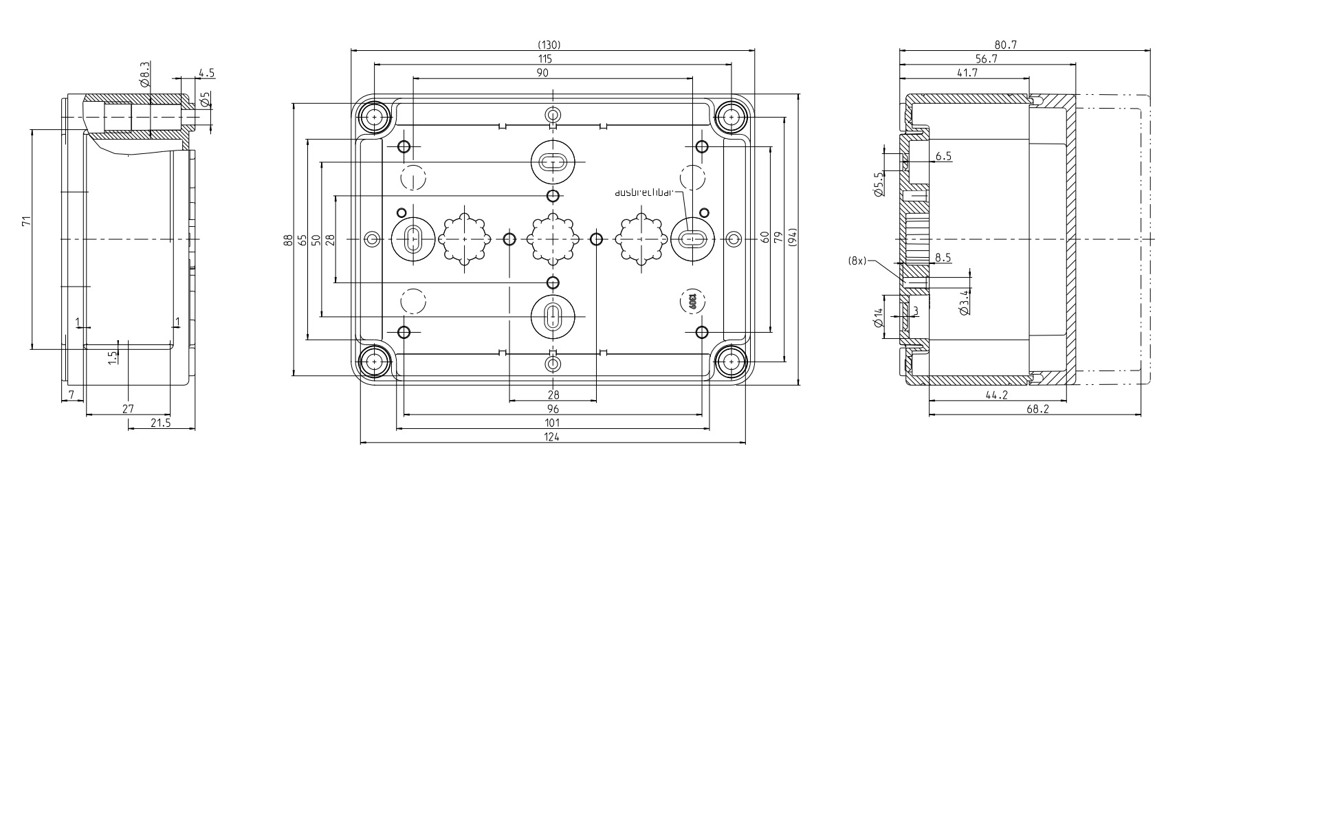 IP66 Polycarbonate Junction box without cable gland knockouts. colour grey RAL 6018, top cover is opaque grey