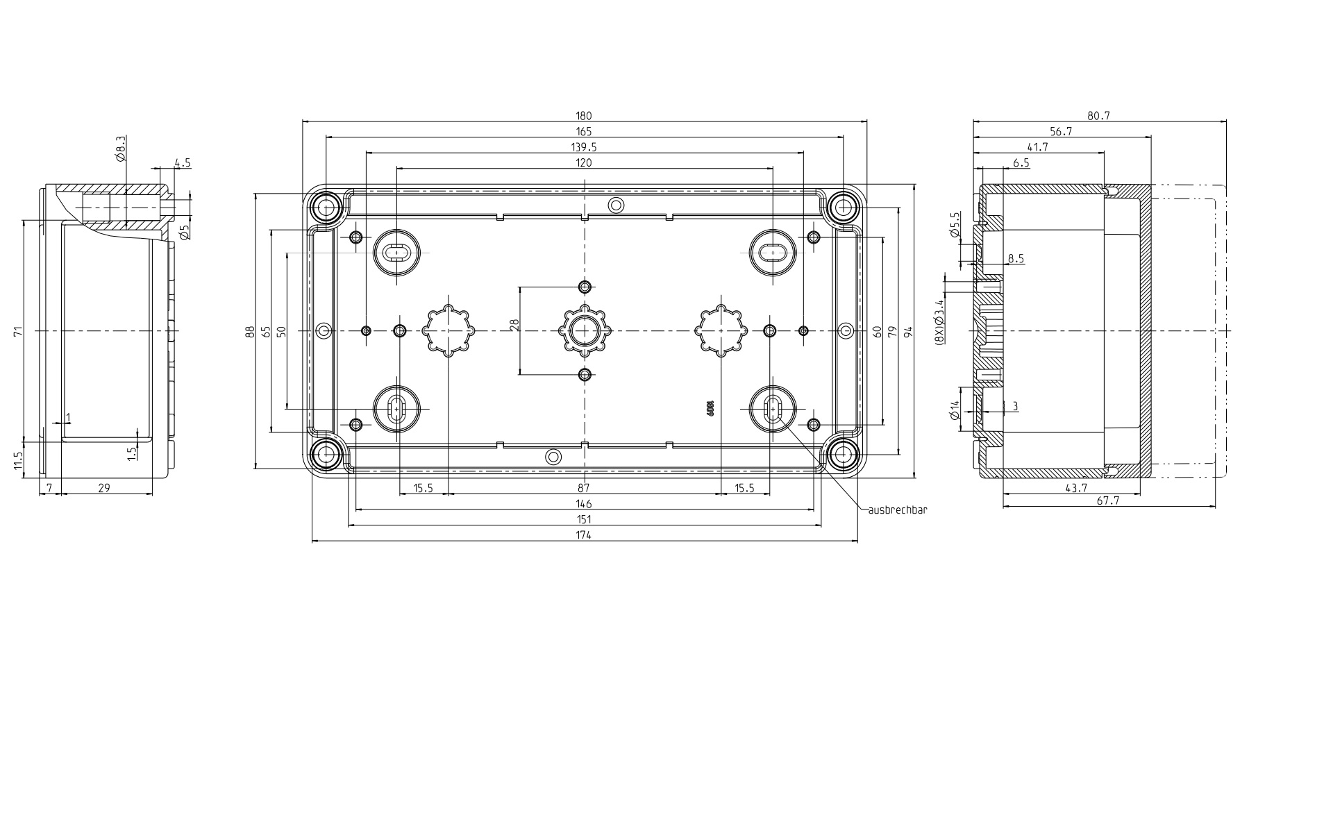 IP66 Polycarbonate Junction box without cable gland knockouts. colour grey RAL 6018, top cover is opaque grey