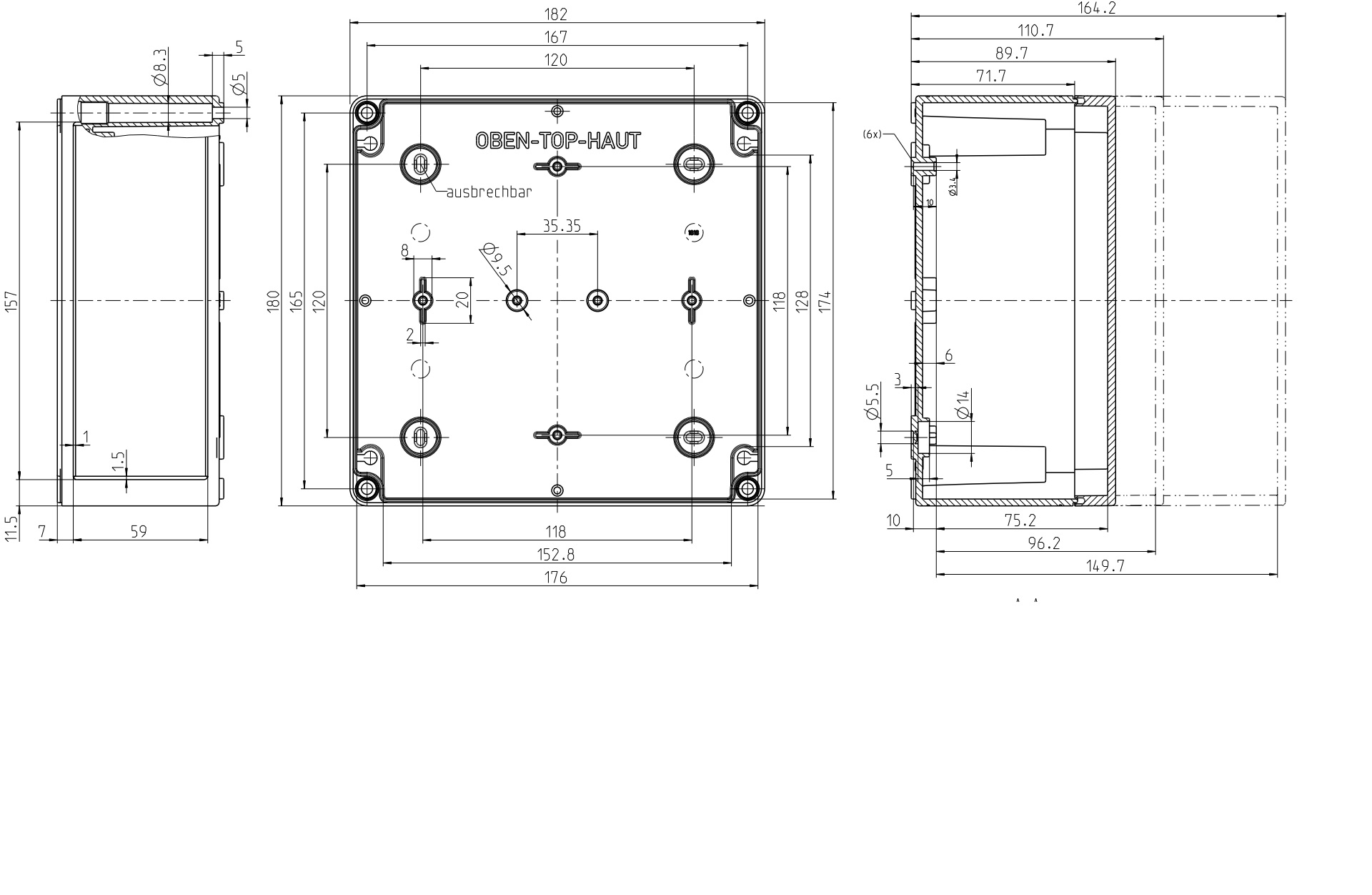 IP66 Polycarbonate Junction box without cable gland knockouts. colour grey RAL 6018, top cover is opaque grey