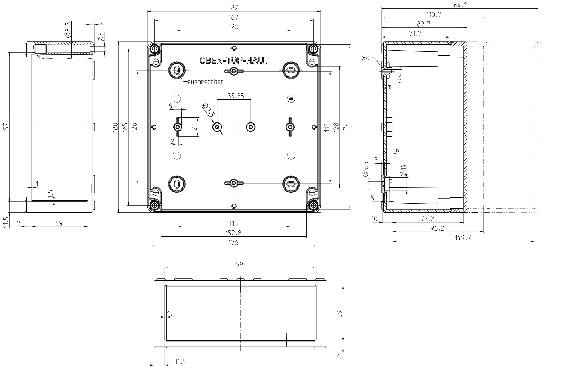 IP66 Polycarbonate Junction box without cable gland knockouts. colour grey RAL 6018, top cover is opaque grey