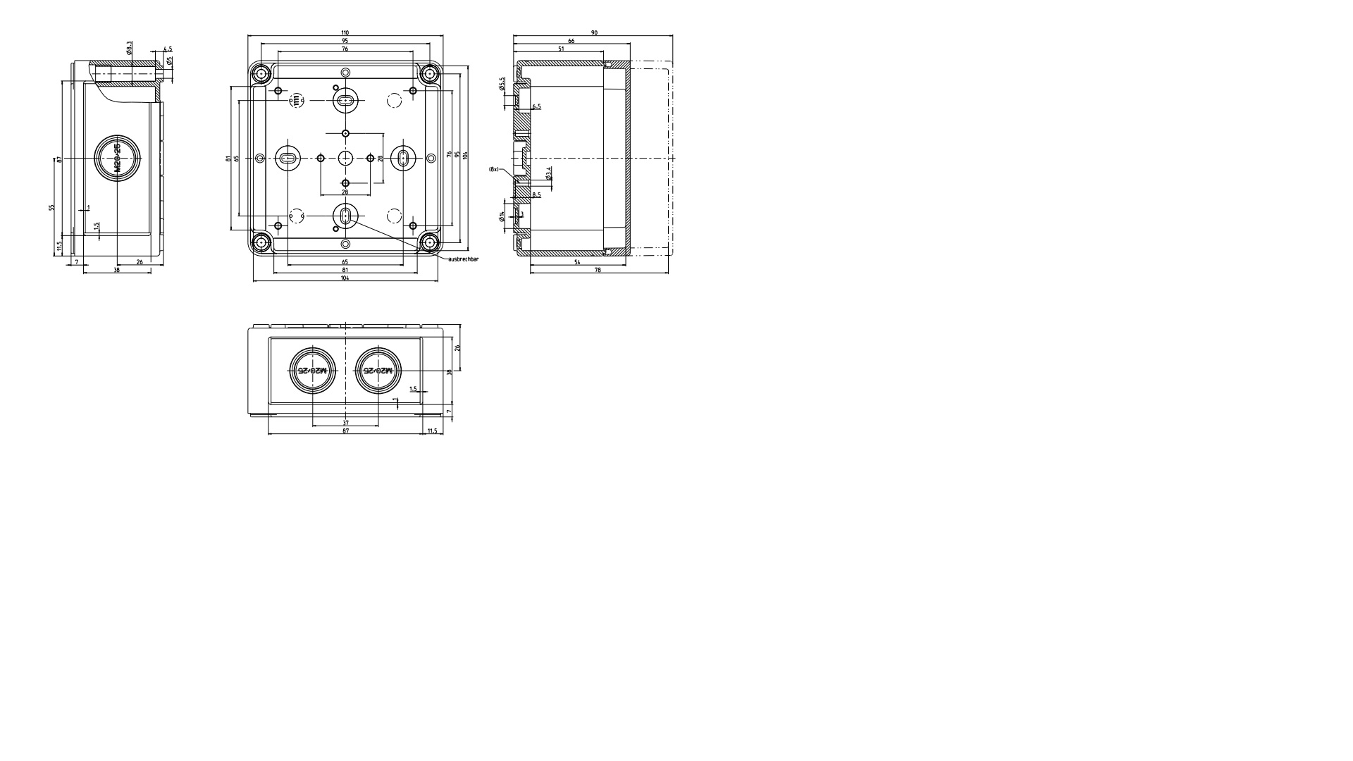 IP66 Polycarbonate Junction box with metric cable gland knockouts 7 x M20/25. colour grey RAL 6018, top cover is opaque grey