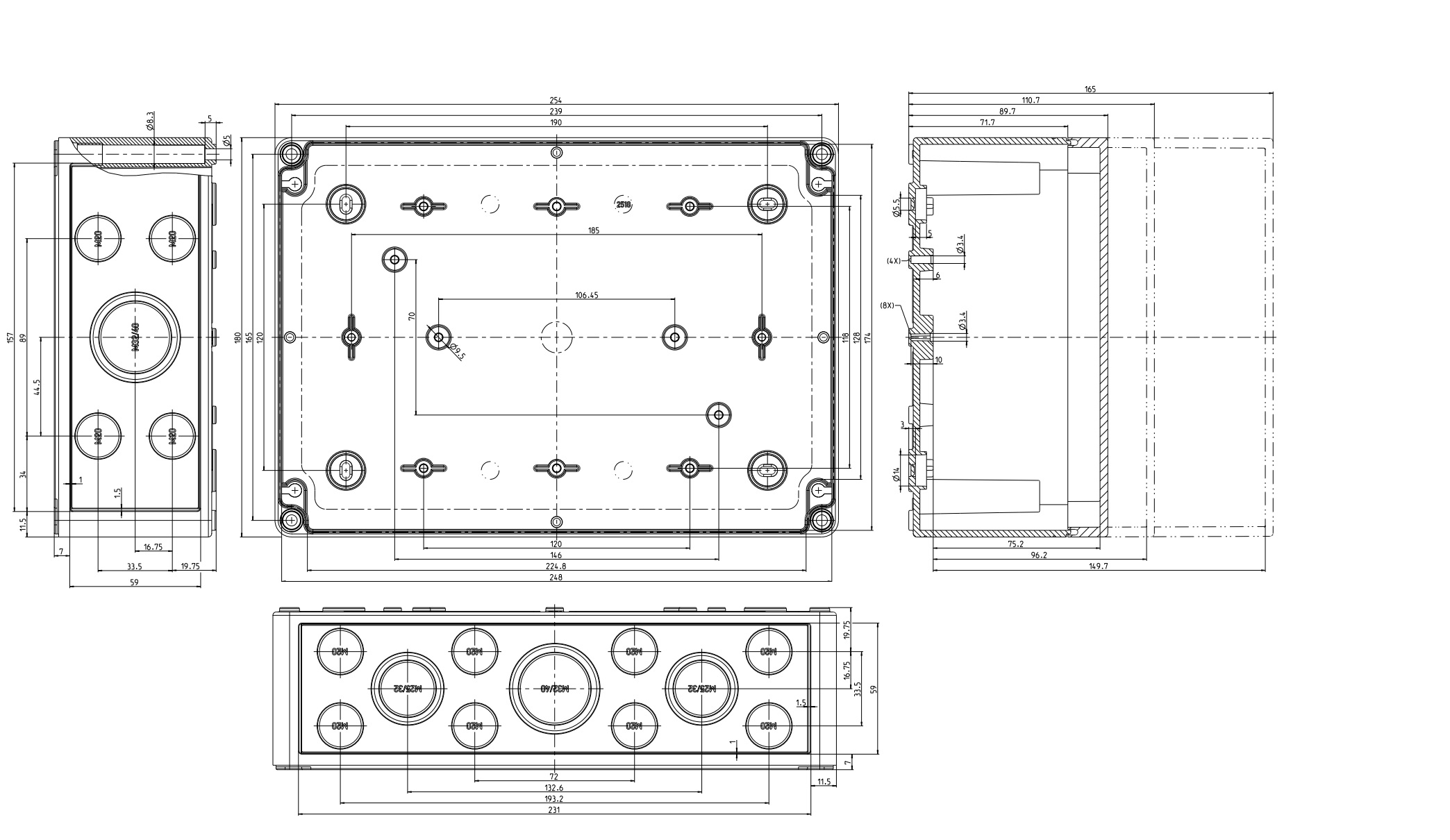 IP66 Polycarbonate Junction box with metric cable gland knockouts 4 x M25/32 4 x M32/40 24 x M20. colour grey RAL 6018, top cover is opaque grey