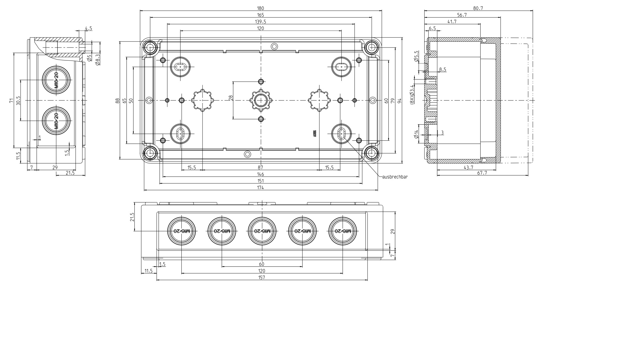 IP66 Polycarbonate Junction box with metric cable gland knockouts 14 x M16/20. colour grey RAL 6018, top cover is opaque grey