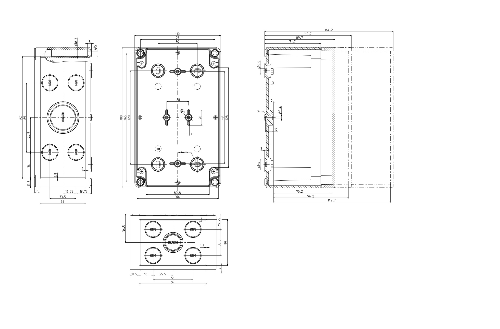 IP66 Polycarbonate Junction box with metric cable gland knockouts 2 x M20/25 2 x M32/40 16 x M20. colour grey RAL 6018, top cover is opaque grey