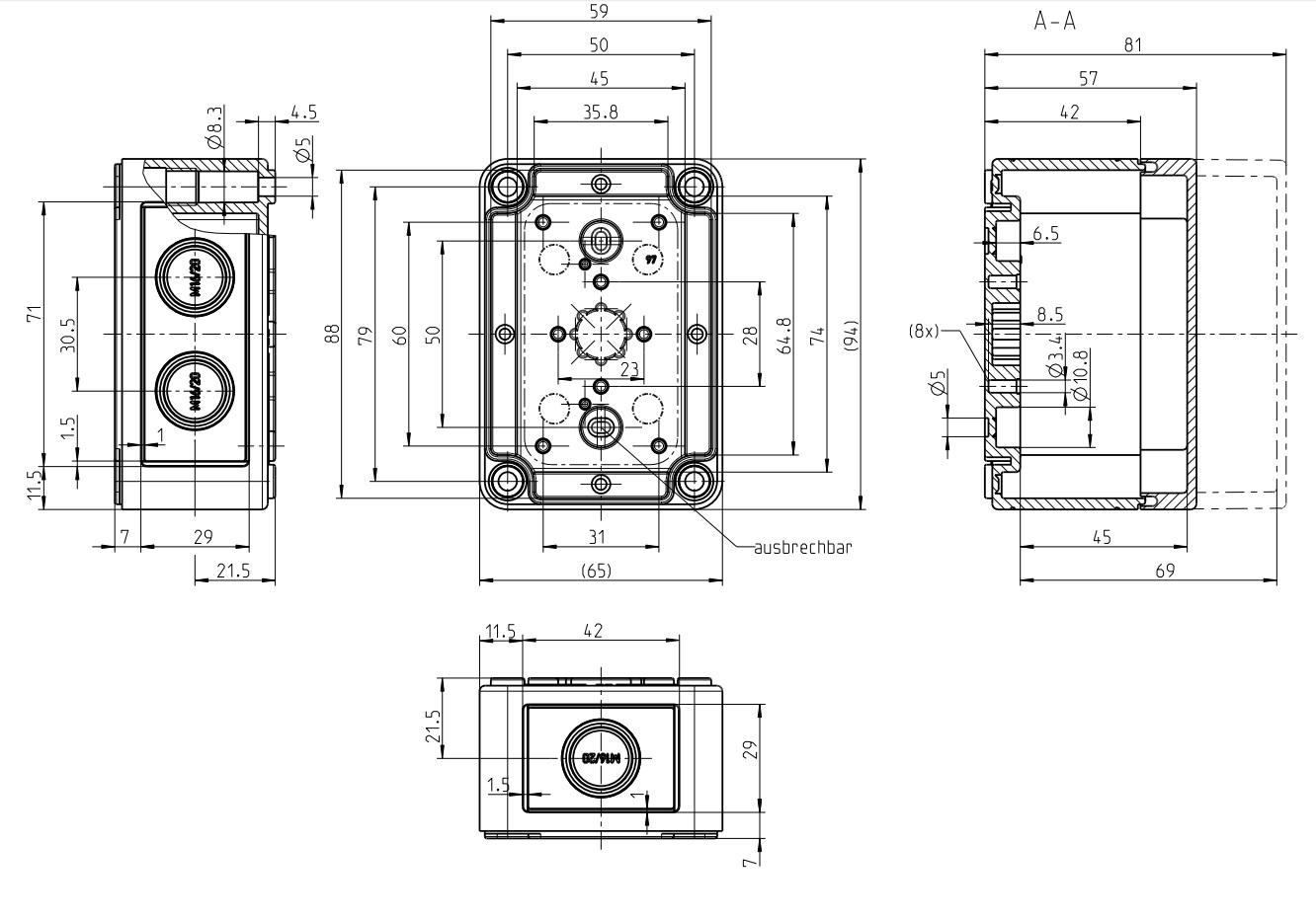 IP66 Polycarbonate Junction box with metric cable gland knockouts 6 x M16/20. colour grey RAL 6018, top cover is transparent