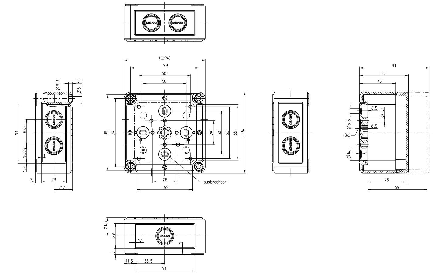 IP66 Polycarbonate Junction box with metric cable gland knockouts 7 x M16/20. colour grey RAL 6018, top cover is transparent