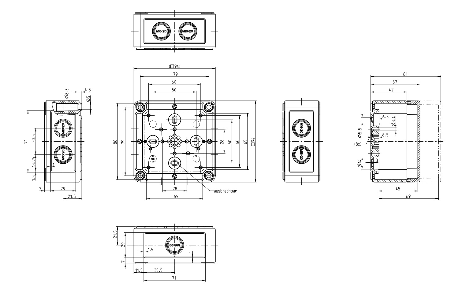 IP66 Polycarbonate Junction box with metric cable gland knockouts 7 x M20/25. colour grey RAL 6018, top cover is transparent