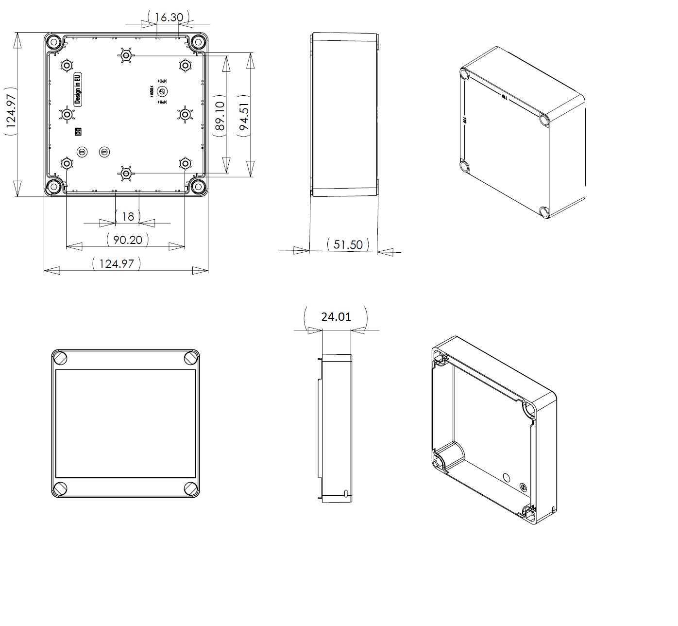 Grey ABS, IK08, IP66 junction box. Features clear lid, captive plastic screws, slots for vertical PCB mounting and supplied with a 35mm Din rail with fixing screws. RAL7035